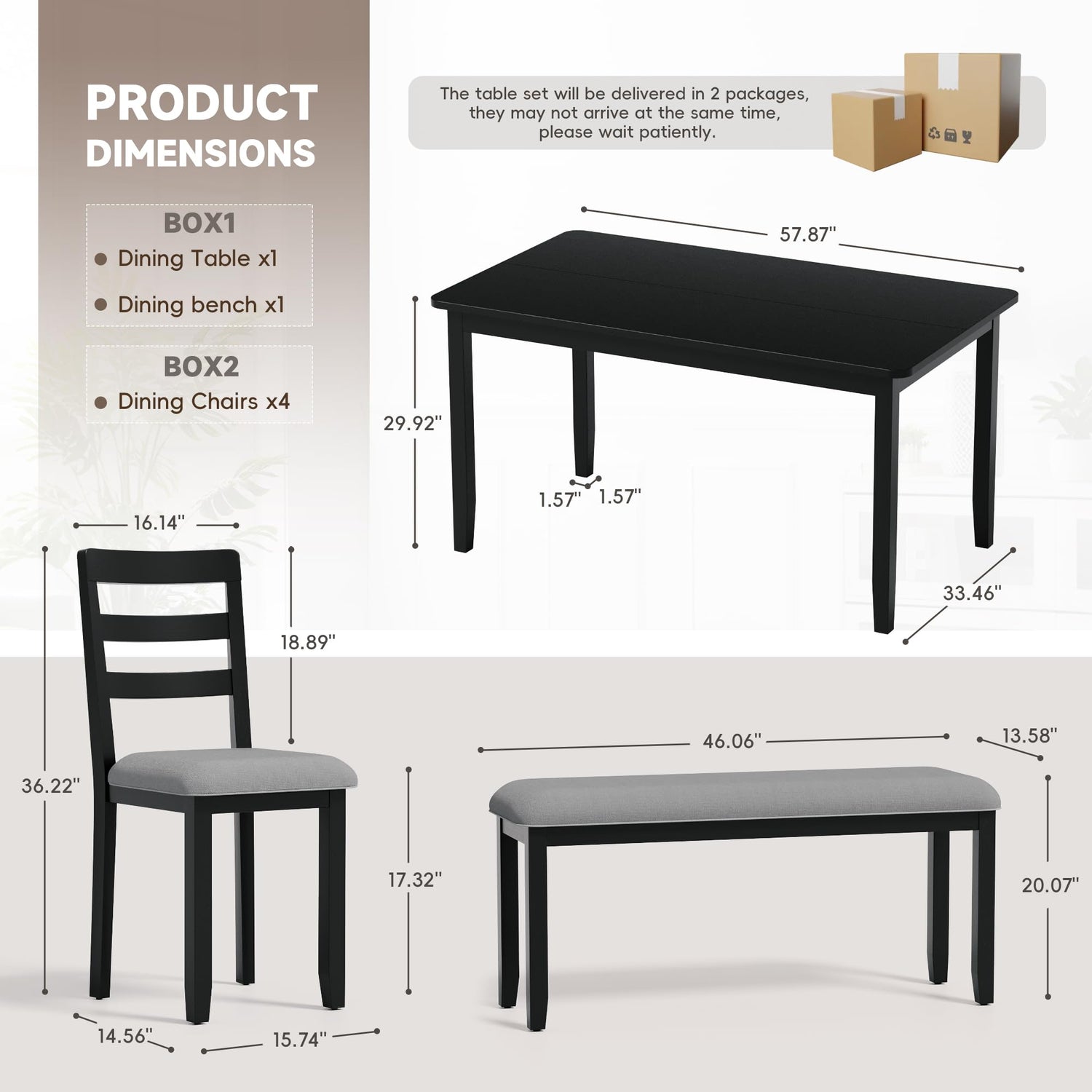 - Product Dimensions: This dining table set contains 1 table, 1 bench and 4 chairs.Table Size: 57.87"W*33.46"D*29.92"H; Bench Size: 46.06"W*13.58"D*17.32"H;Chair Size: 15.74"W*14.56"D*36.22"H