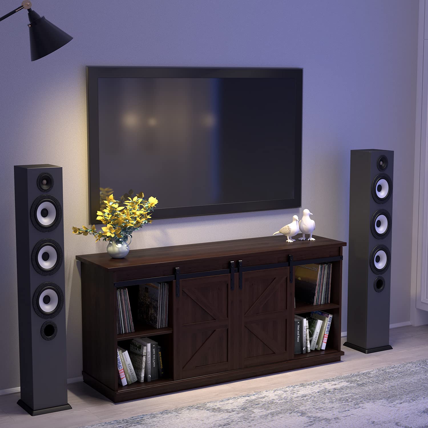 - Sufficient Storage Space: This TV stand console comes with 2 cabinets of storage space and 2 open spaces in the barn doors on both sides with 3 levels of adjustable and removable shelves, providing abundant storage or display space for CDs, DVDs, game boxes, decorative items and more. The spacious tabletop supports 40, 43, 50, 55, 60, and 65 inch TV.