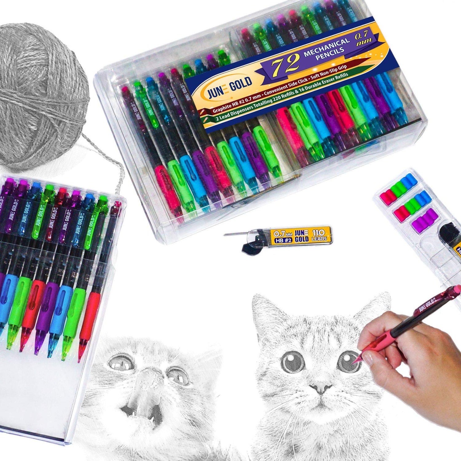 June Gold 72 Mechanical Pencils, 0.7 mm HB Lead, 2 Lead Dispensers with 220 Refills & 16 Erasers, Break Resistant, Convenient Side Click & Soft Non-Slip Grip
