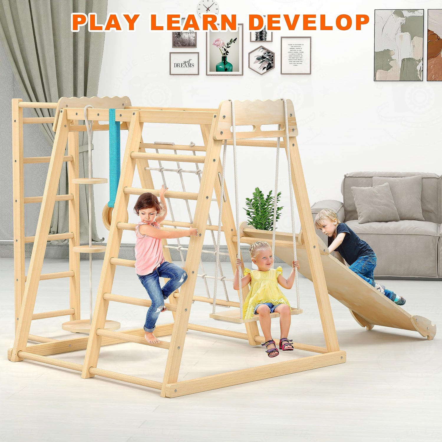 - MULTIFUNCTION JUNGLE GYM FOR ENDLESS FUN - Your child will never be bored, with a mini climbing wall, Swedish slide, horizontal bar, rope ladder, wooden ladder and swing set all included in the Wofafa Indoor Playground. Each activity is designed to spark a child's imagination and develop their motor skills, making it the perfect indoor playset for toddlers and kids
