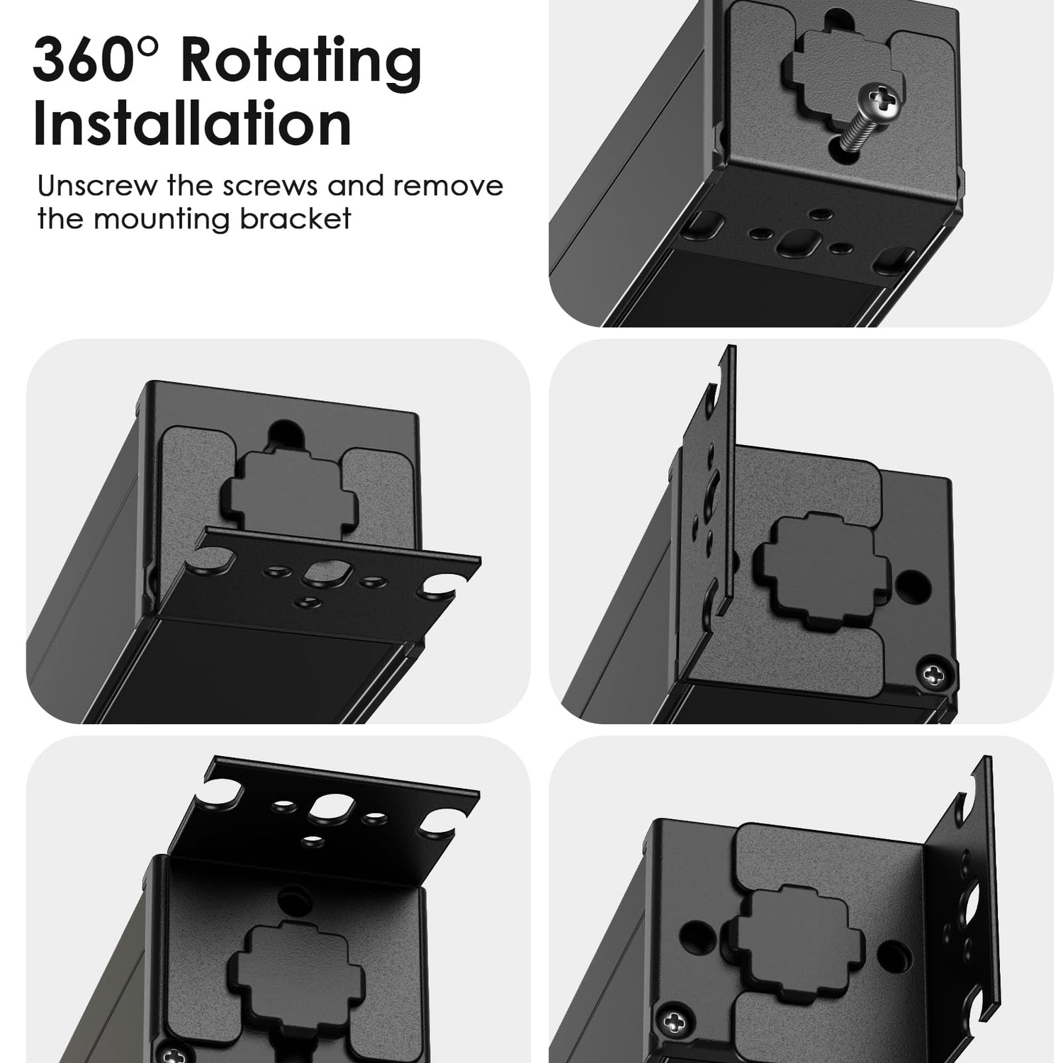 - Multiple Installation Options: The mounting brackets on both sides of the outlet strip can be installed flexibly in four directions, for a variety of scenes. 2 mounting brackets are locked on two sides of power bar when not in use, so they will not take up space and get lost.