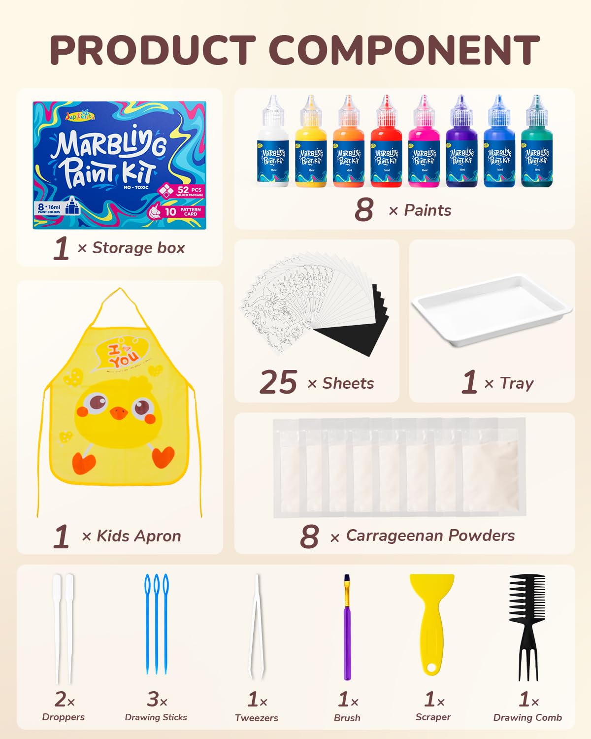 - Perfect Gift Choice: This arts and crafts kit includes 8 colors of paint (16ml each), 10 blank sheets, 10 pattern cards, 8 packets of 3g carrageenan powder, 5 black cardboards, 3 drawing sticks, 2 droppers, a drawing comb, a brush, tweezers, a tray, a scraper, and a kids' apron. This water toy set is an ideal birthday present for girls and boys, as well as Christmas or DIY gifts