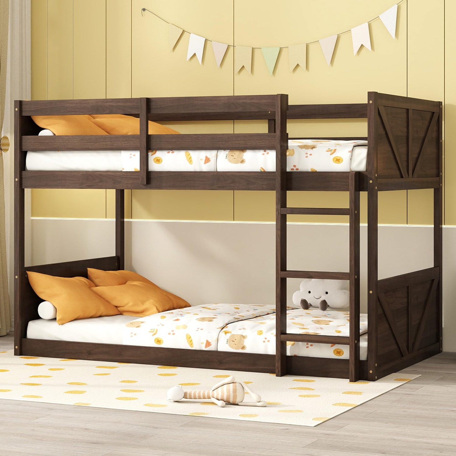 jurmiture Bunk Bed Twin Over Twin Low Bunk Bed, Floor Bunkbeds with Panelled Headboard and Footboard, Solid Rubber Wood Foundation with Safety Guardrails, Built-in Ladder, Antique Oak