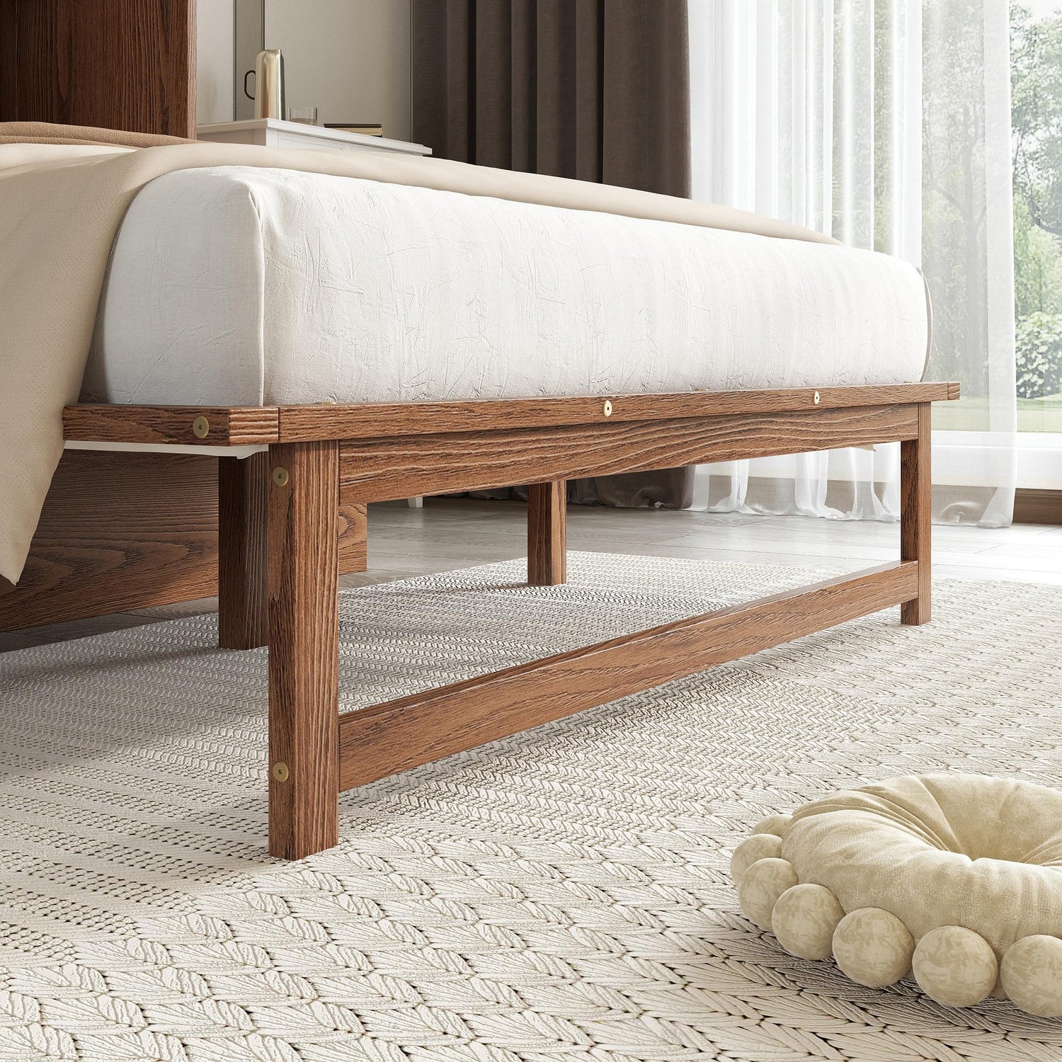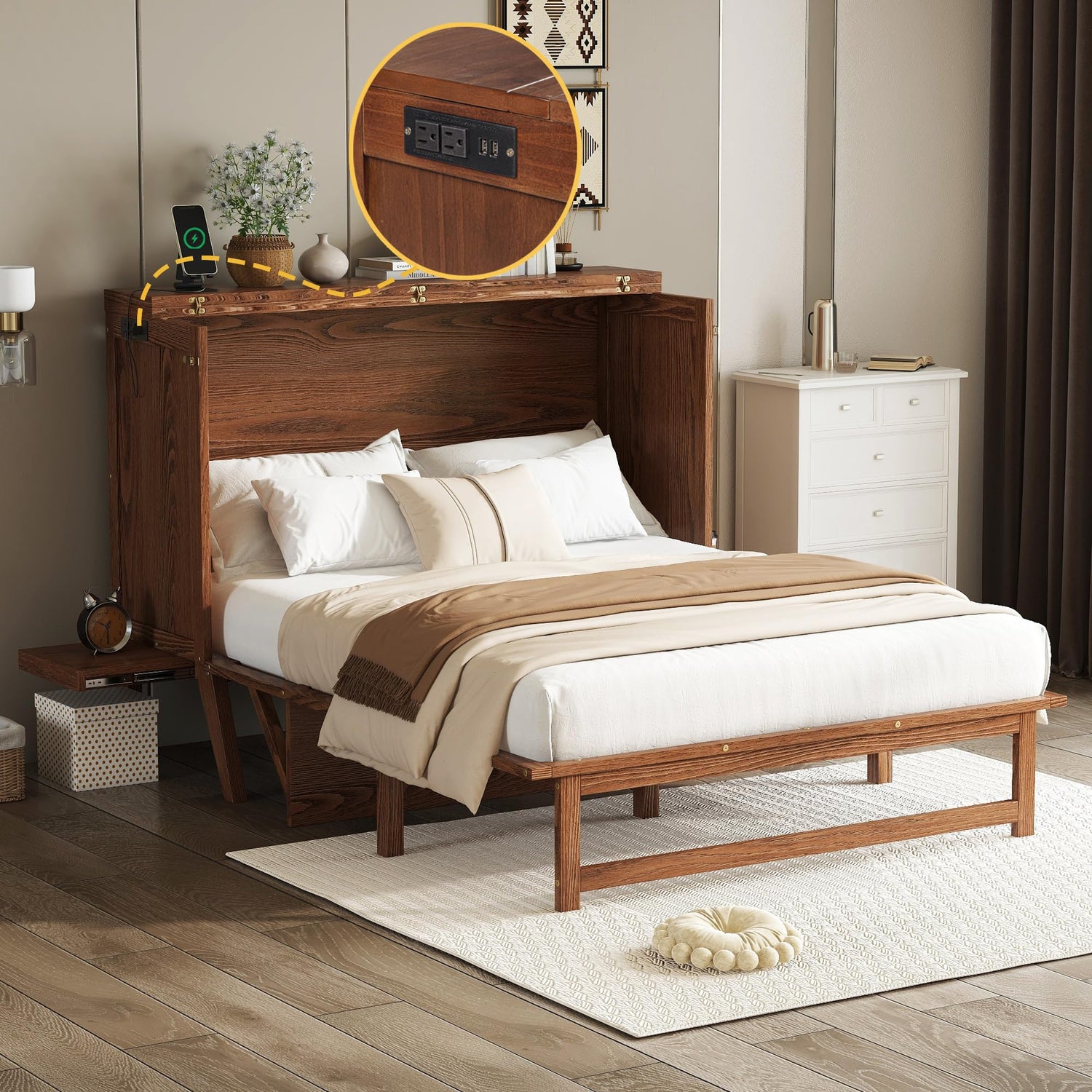 jurmiture Full Size Murphy Bed with USB Port and Removable Shelves on Each Side, Solid Pine Murphy Cabinet Bed for Home Office, Guest Room, Walnut