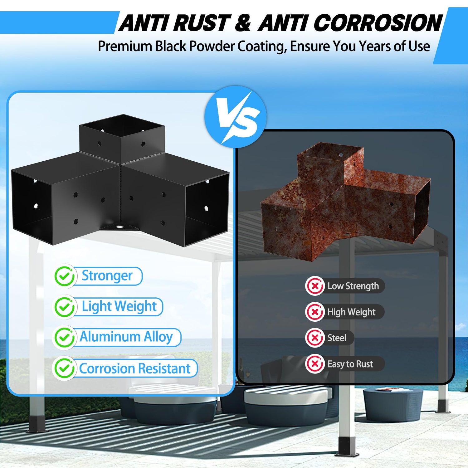 • Rust and Corrosion Resistance:Constructed with high-grade Aluminum Alloy and coated with a protective layer, these brackets offer exceptional rust and corrosion resistance. Perfect for outdoor use, they retain their appearance and structural integrity even in rain, snow, or humid environments, ensuring a long-lasting solution for your pergola or gazebo.