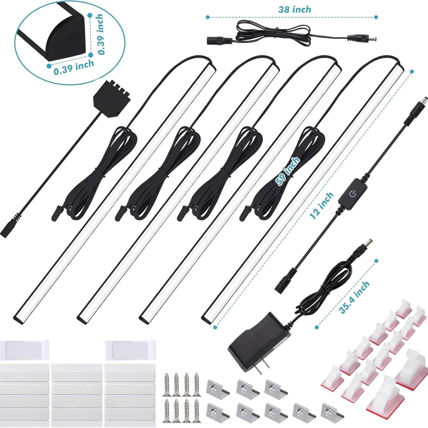 - 💡"Bright" - This display case lights kit includes 4 LED light bars that plug into a central hub with a switch about halfway between the hub and outlet plug. Each light bar has 33 LEDs and 300 lumens, covering a wide range. These cabinet lights are an economical choice compared to buying hardwired LED fixtures.