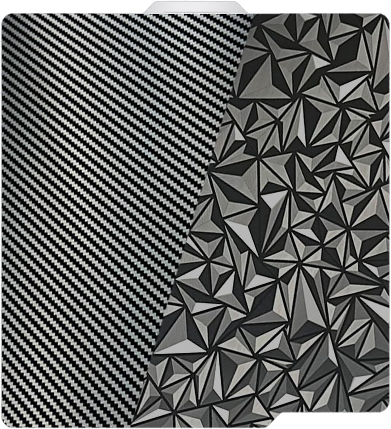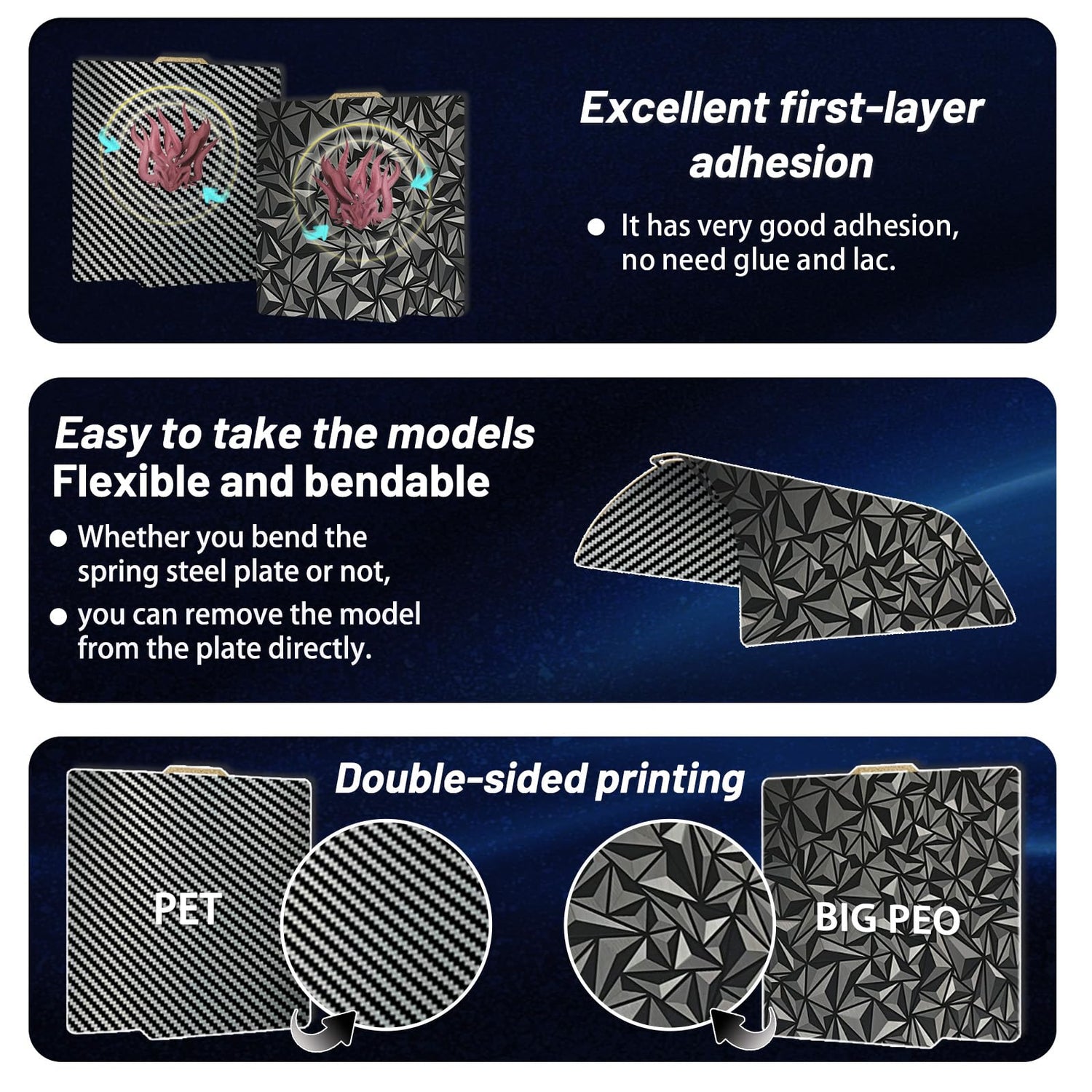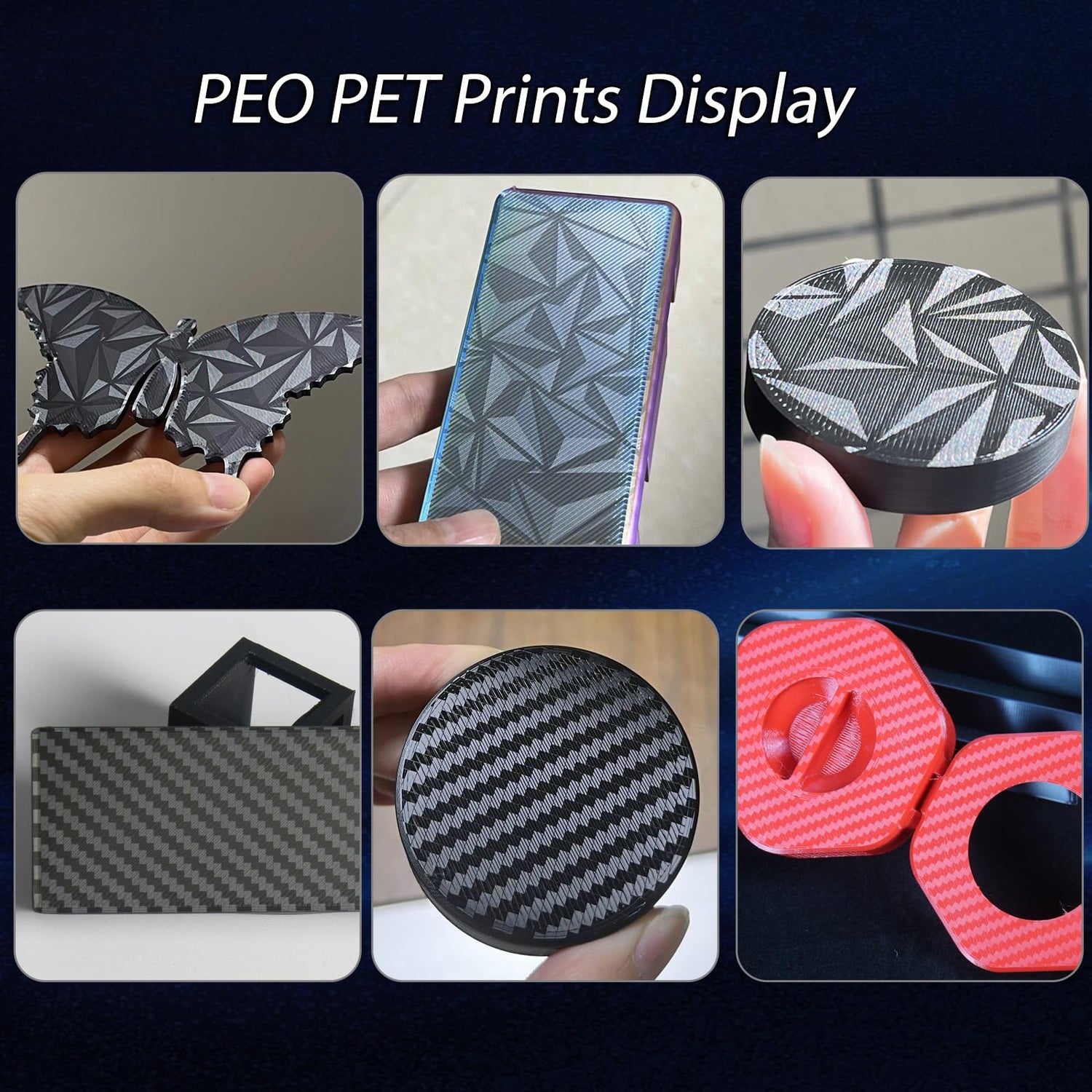 - 【Upgraded build plate】Double-sided Big PEO and Carbon Fiber PET spring steel plate,One side is upgraded big PEO film .big PEO looks like countless diamonds on the surface,which make your eyes light up.The other side is smooth PET.the bottom of the printed model is smooth.One build plate has two beautiful patterns. The bottom of the prints will leave a unique pattern.
