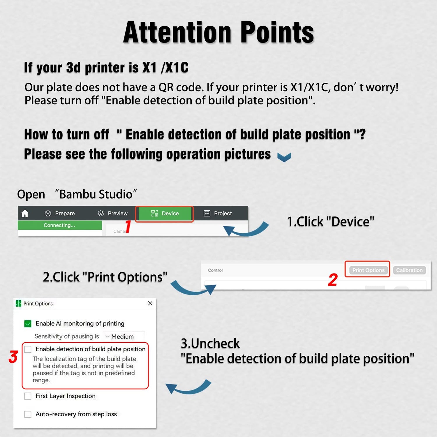 - 【Excellent adhesion for first printing layer】The model can be firmly attached to the surface of the print bed.Easily print even for a newbie. Please let the build plate cool down before remove the model to avoid damaging the coating.If your printer is X1 series, please turn off "Enable detection of build plate position", otherwise it will casued bad adhesion.