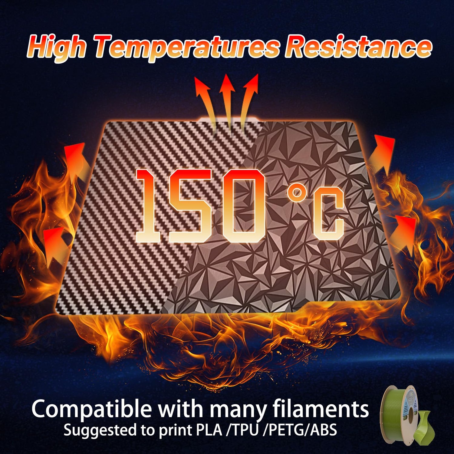 - 【High Resistance and Compatible Filaments】The big PEO print bed surface is resistant to high temperature 150℃ and smooth PET coating bed is 150℃. After our extensive testing, we recommend big PEO+PET to print PLA / TPU /PETG,If you want to print other filaments, please adjust the parameters.