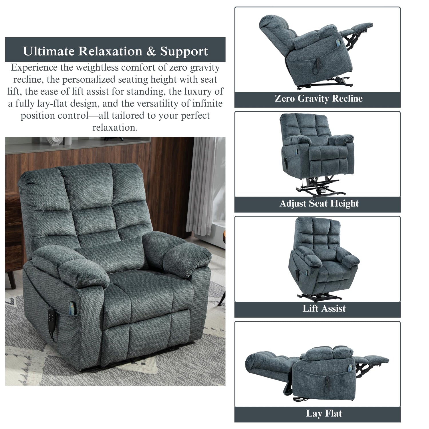 - Adjustable Seat Height with Lift Assist Functionality: Customize your seat elevation to perfectly suit your needs with this lift recliner chair, whether for longer legs or a preference for higher seating. The integrated lift assist function gently transitions you to a standing position, offering effortless mobility support. Important Note: Ensure the chair is placed on a stable surface and properly balanced before adjusting the seat height to prevent wobbling or tipping