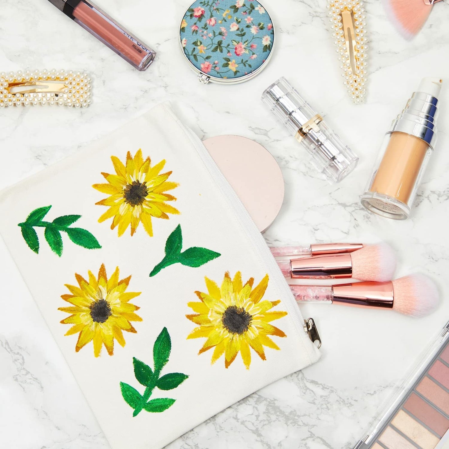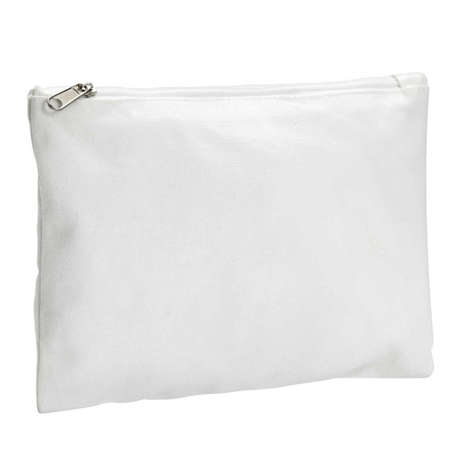 - White Makeup Bag: This 12-pack of design-your-own canvas cosmetic pouches with silver-tone hardware features a blank design and convenient size, making them the perfect cosmetic storage pouch