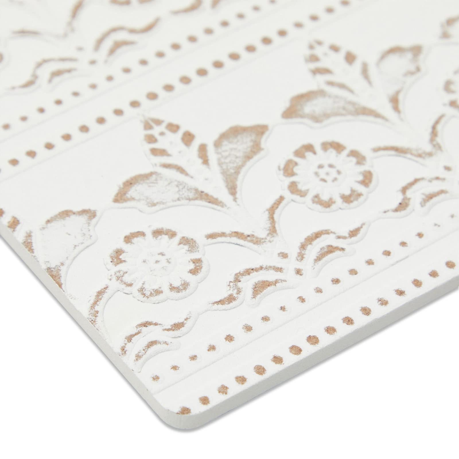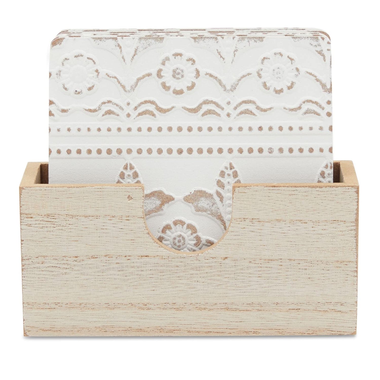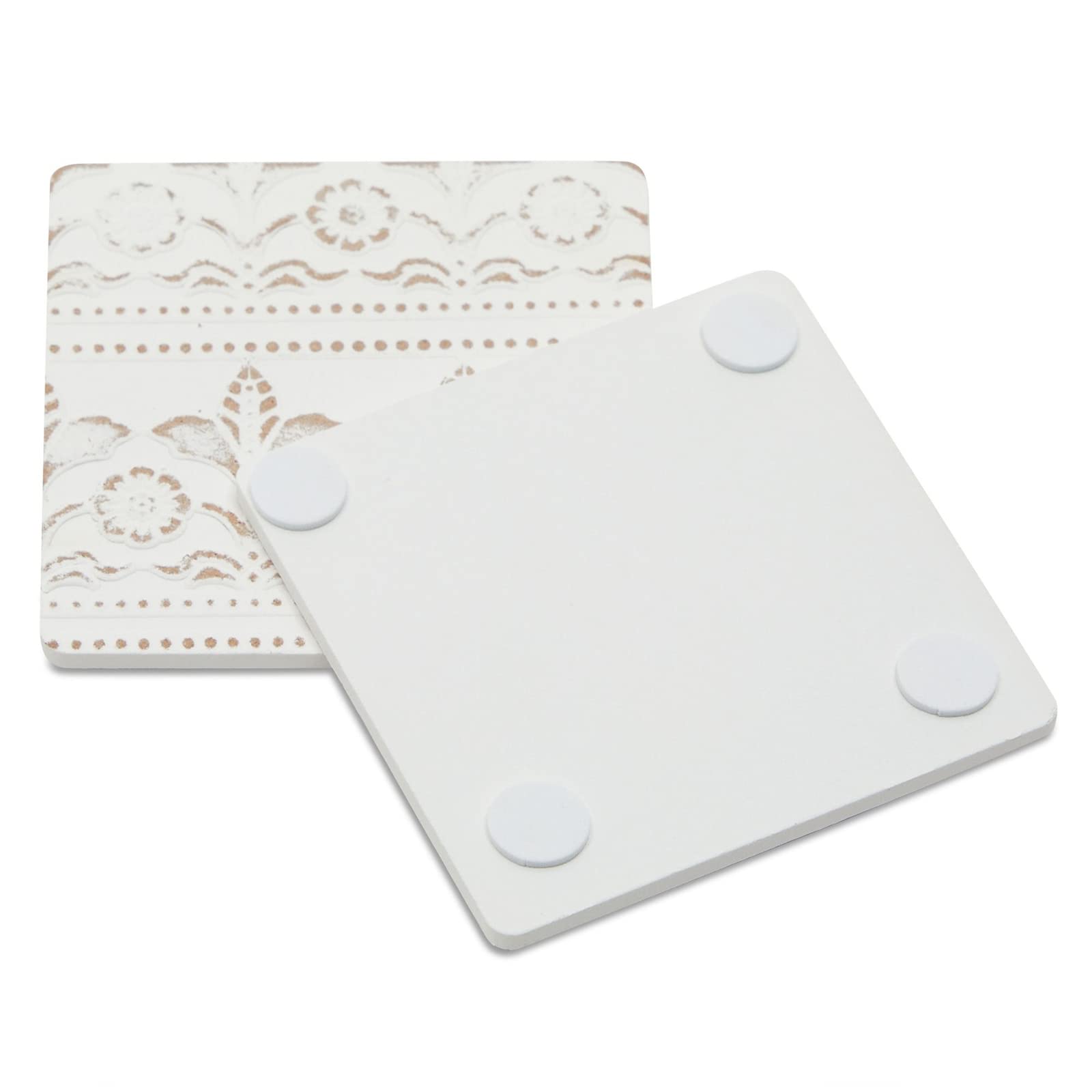 Juvale Set of 6 White Wooden Coasters with Holder for Drinks, Coffee Table, and Floral Farmhouse Decor (3.8 Inches)
