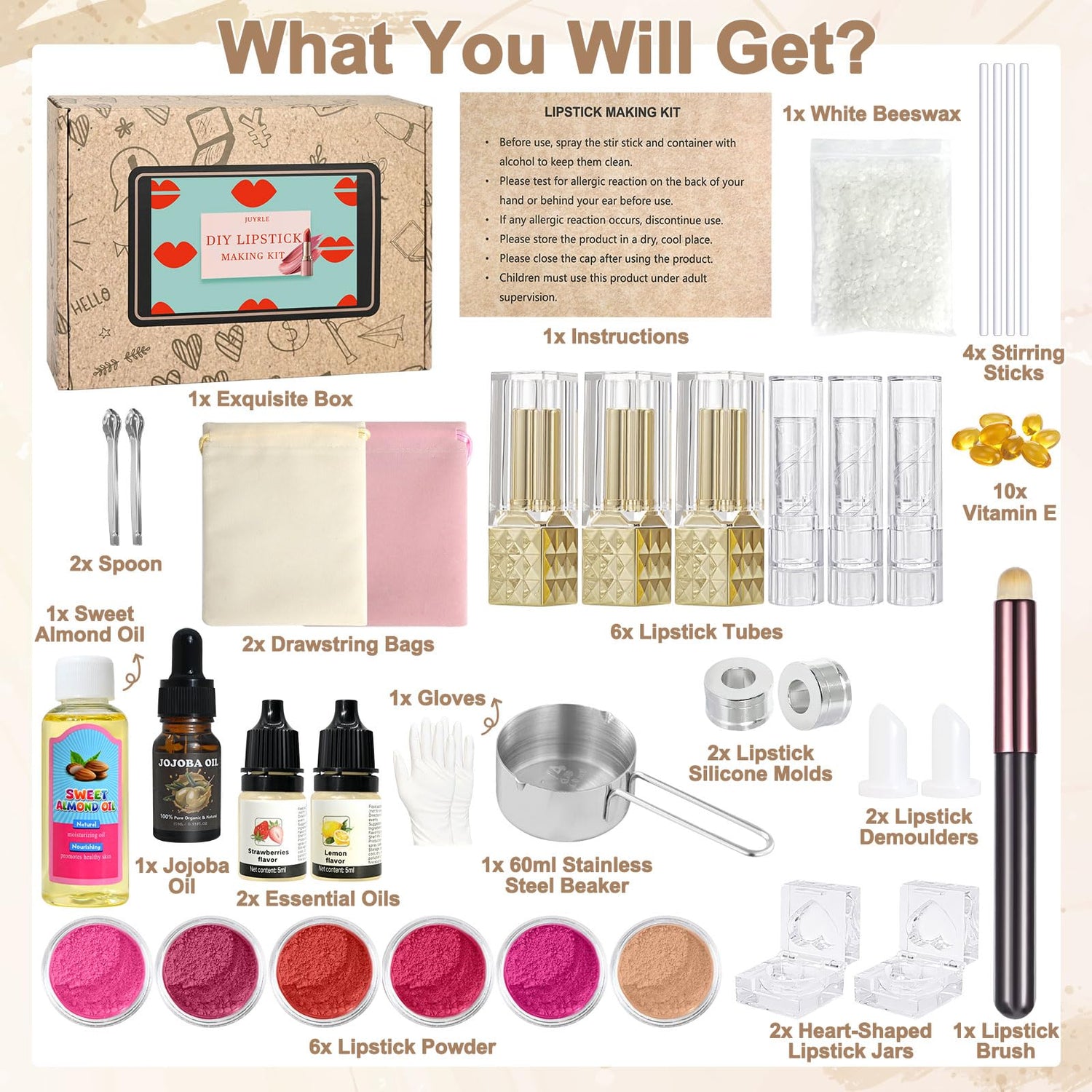 • Complete Lipstick Set: Everything you need to make your own matte velvet lipstick is packed in one convenient box! 6x Lipstick Tubes, 2x Heart-Shaped Lipstick Jars, 1x White Beeswax, 1x Jojoba Oil, 1x Sweet Almond Oil, 10x Vitamin E, 2x Essential Oils, 6x Lipstick Powder, 1x Lipstick Brush, 1x 60ml Stainless Steel Beaker, 1x Lipstick Stand, 2x Lipstick Silicone Molds, 2x Lipstick Demoulders, 2x Drawstring Bags, 4x Stirring Sticks, 2x Spoons, 1x Gloves, 1x Instructions, 1x Exquisite Box.