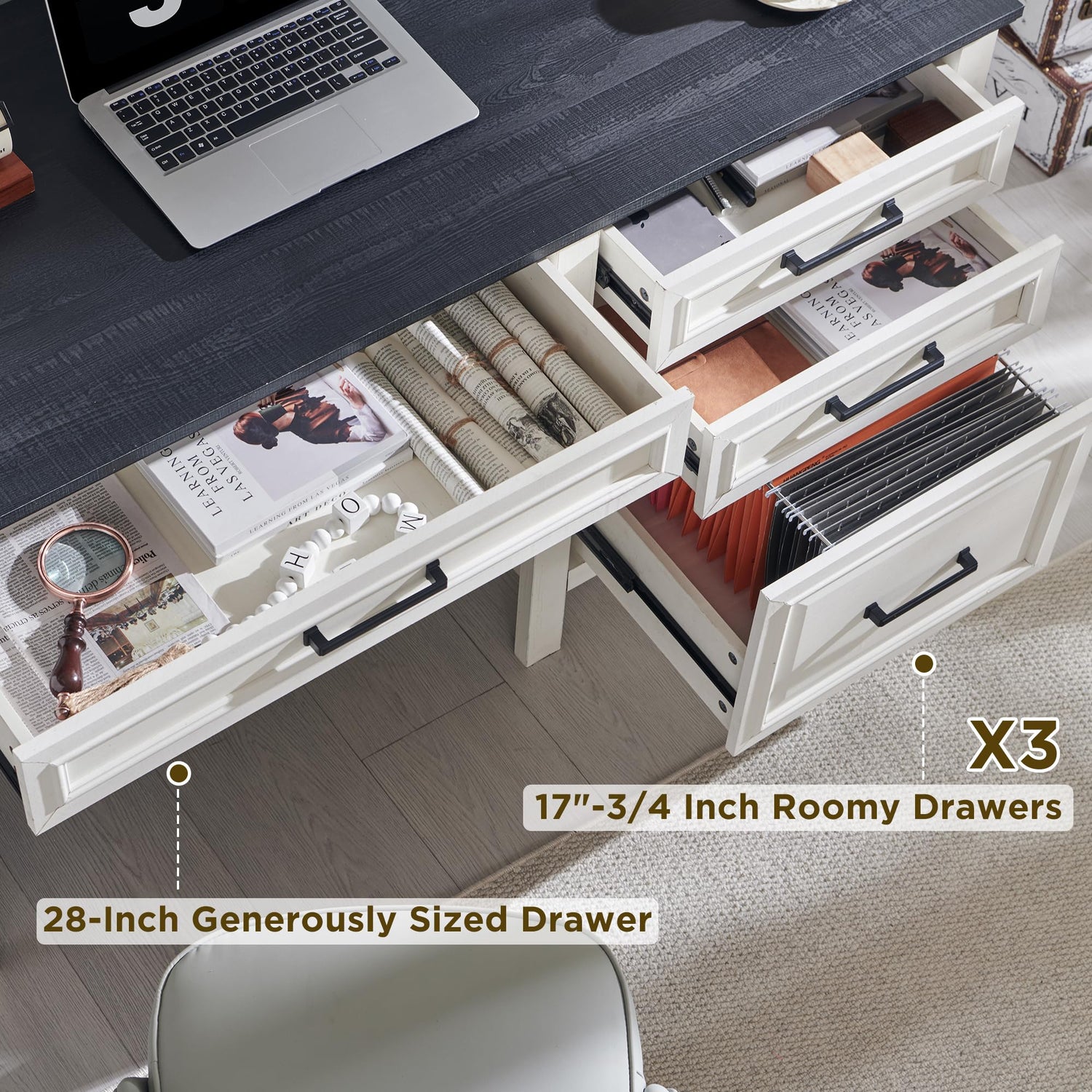 - Ample Drawer Space: In addition to the file drawer, enjoy three large drawers for storage. The largest drawer spans an impressive 28 inches in width perfect for storing larger items, and other 2 moderately sized 18-inch drawer suitable for a variety of items.