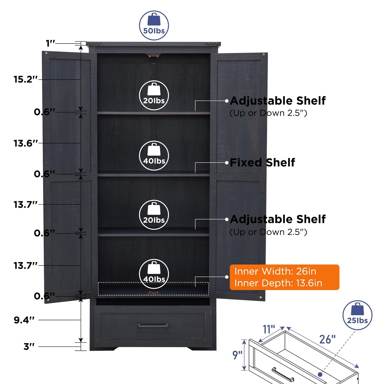 - ๐ Generous Storage: This kitchen pantry cabinet measures 32" W x 16" D x 71" H, with drawers sized at 26" W x 11" D x 9" H. Spacious and versatile storage, keeps your room organized and beautifully decorated. The two middle shelves within the cabinet are both adjustable and removable, featuring three height options that cater to your different storage preferences.