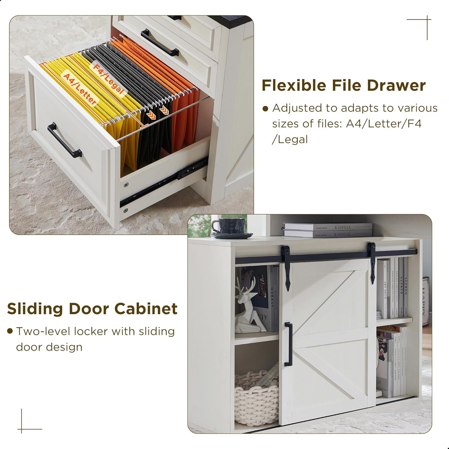 JXQTLINGMU Computer Desk with Darwers & Storage Cabinet, Home Office Desk with File Drawer, Gaming Desk with Monitor Stand & Charging Station, Off White