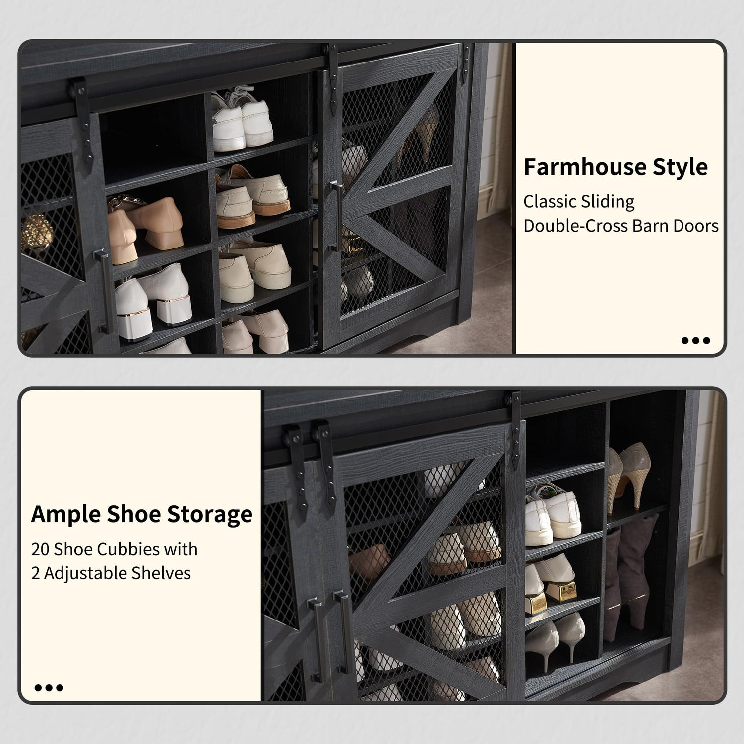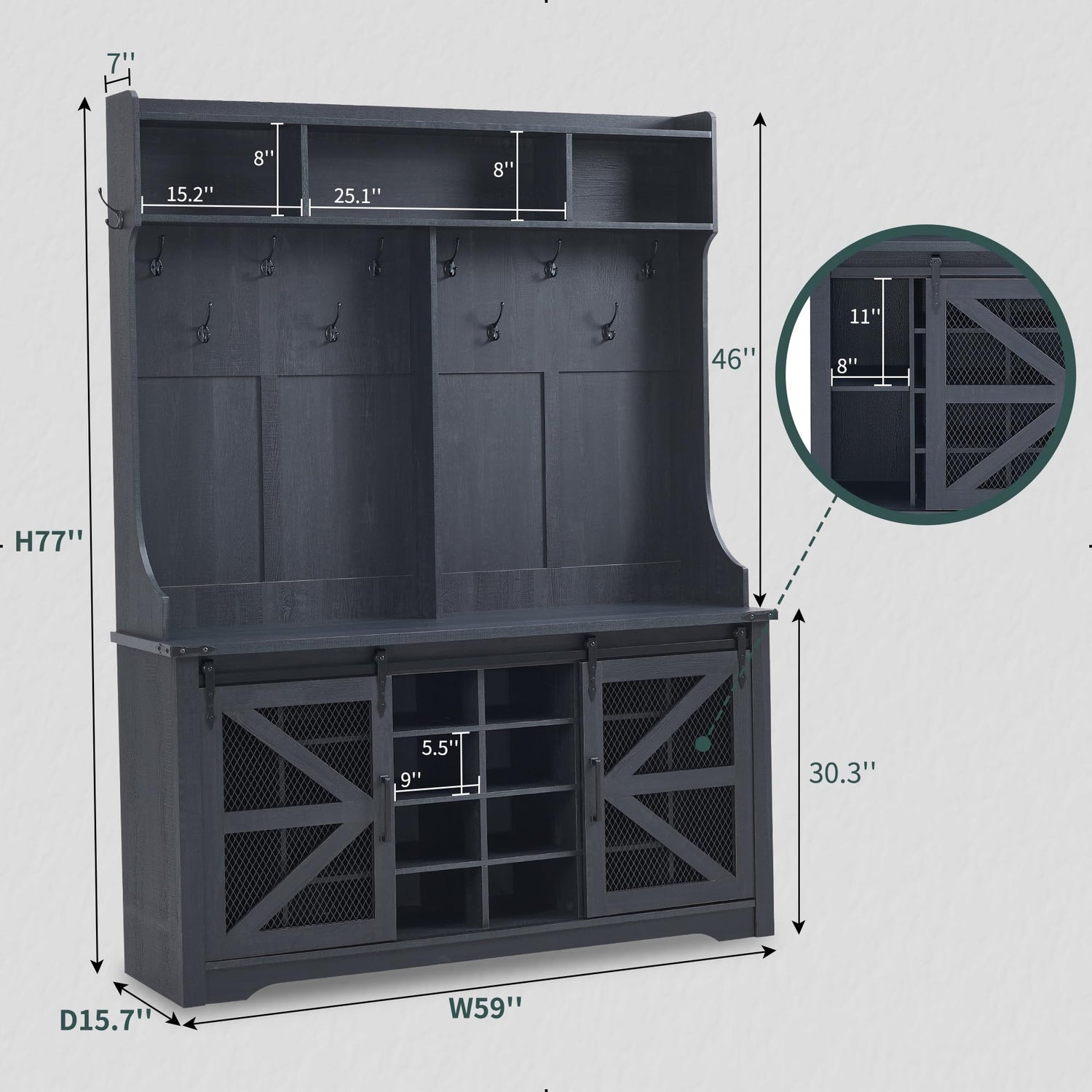 JXQTLINGMU Farmhouse Entryway Hutch with Coat Rack, 20 Shoe Cubbies & 12 Coat Hooks Wide Hall Tree with Shoe Storage Bench, Mudroom Storage Cabinet (Black)