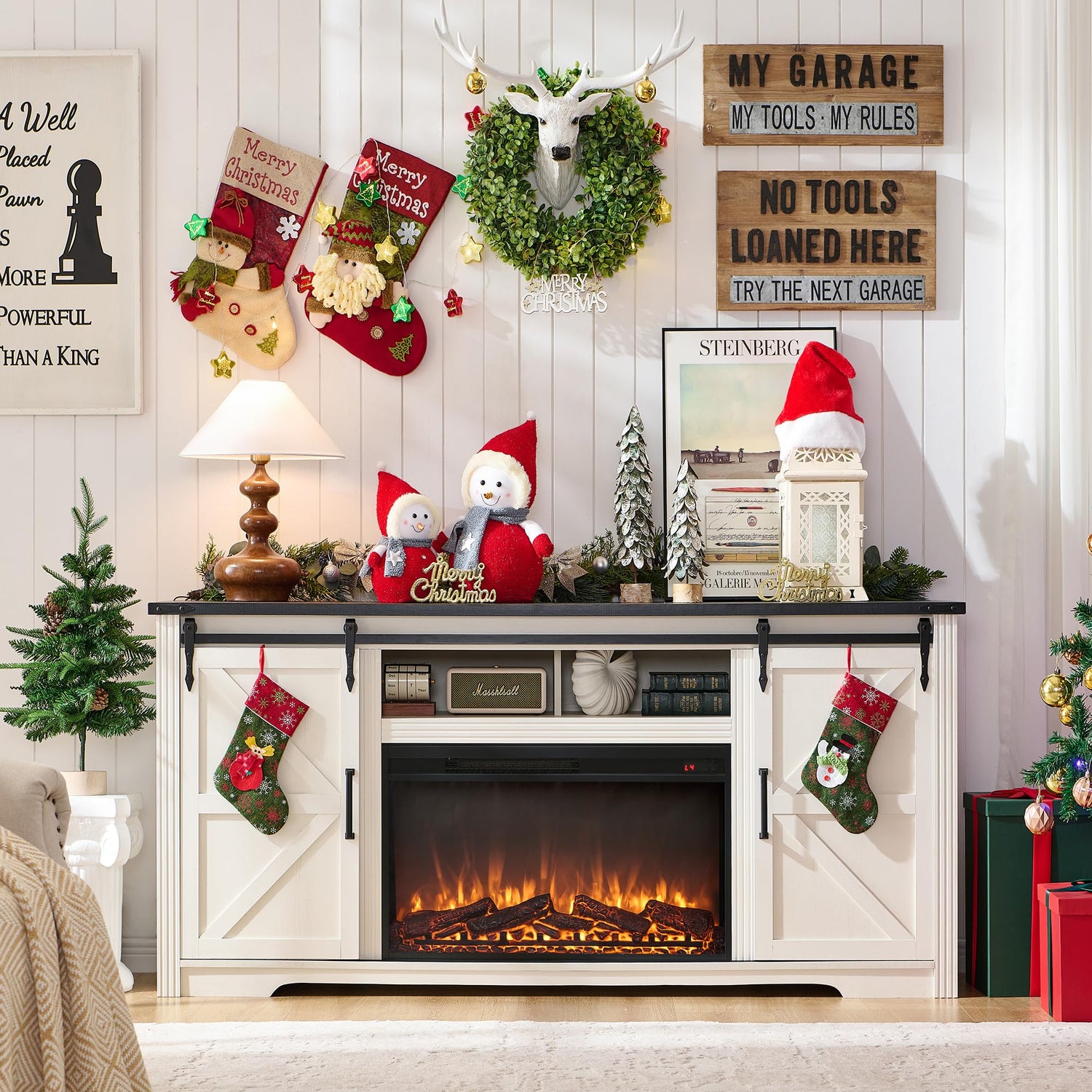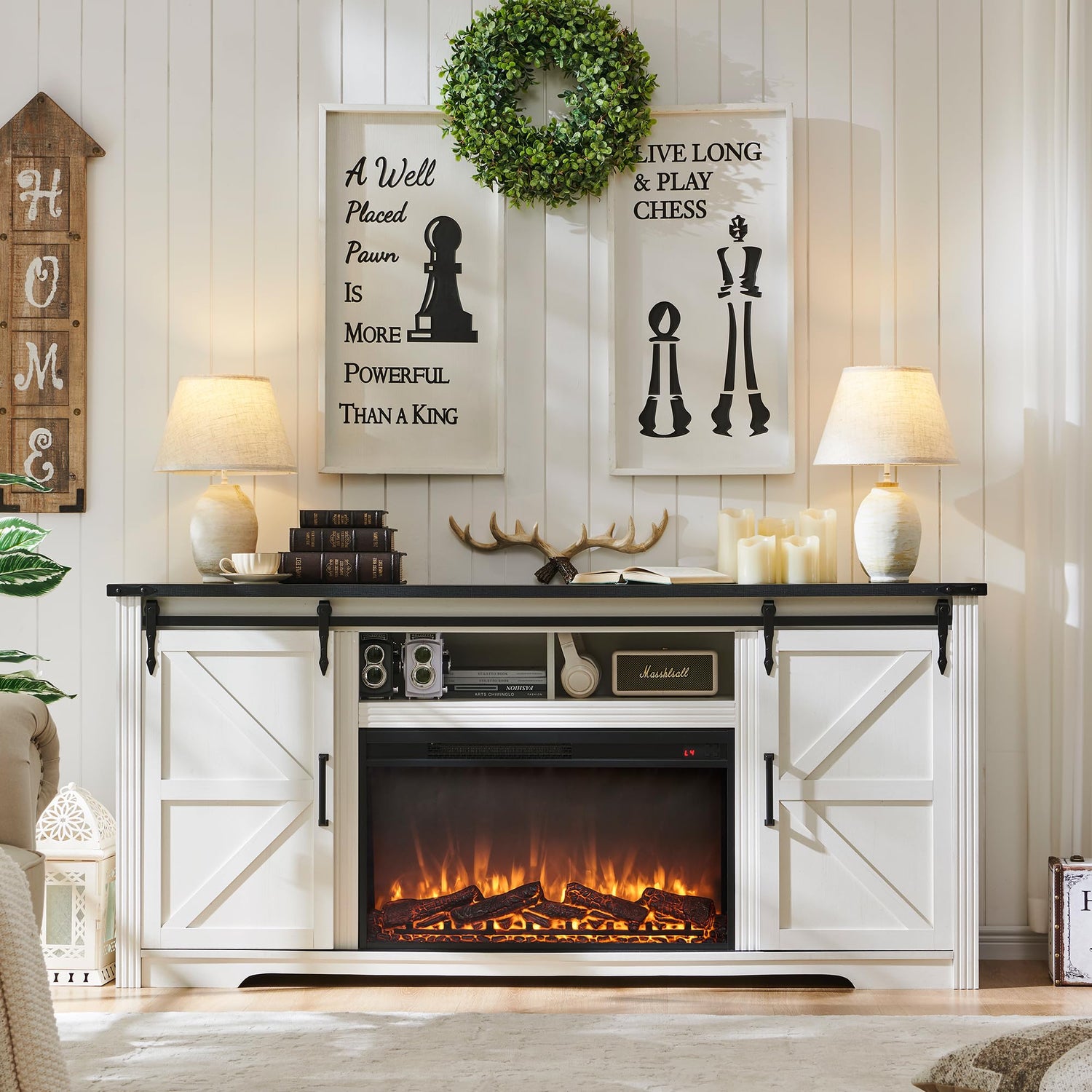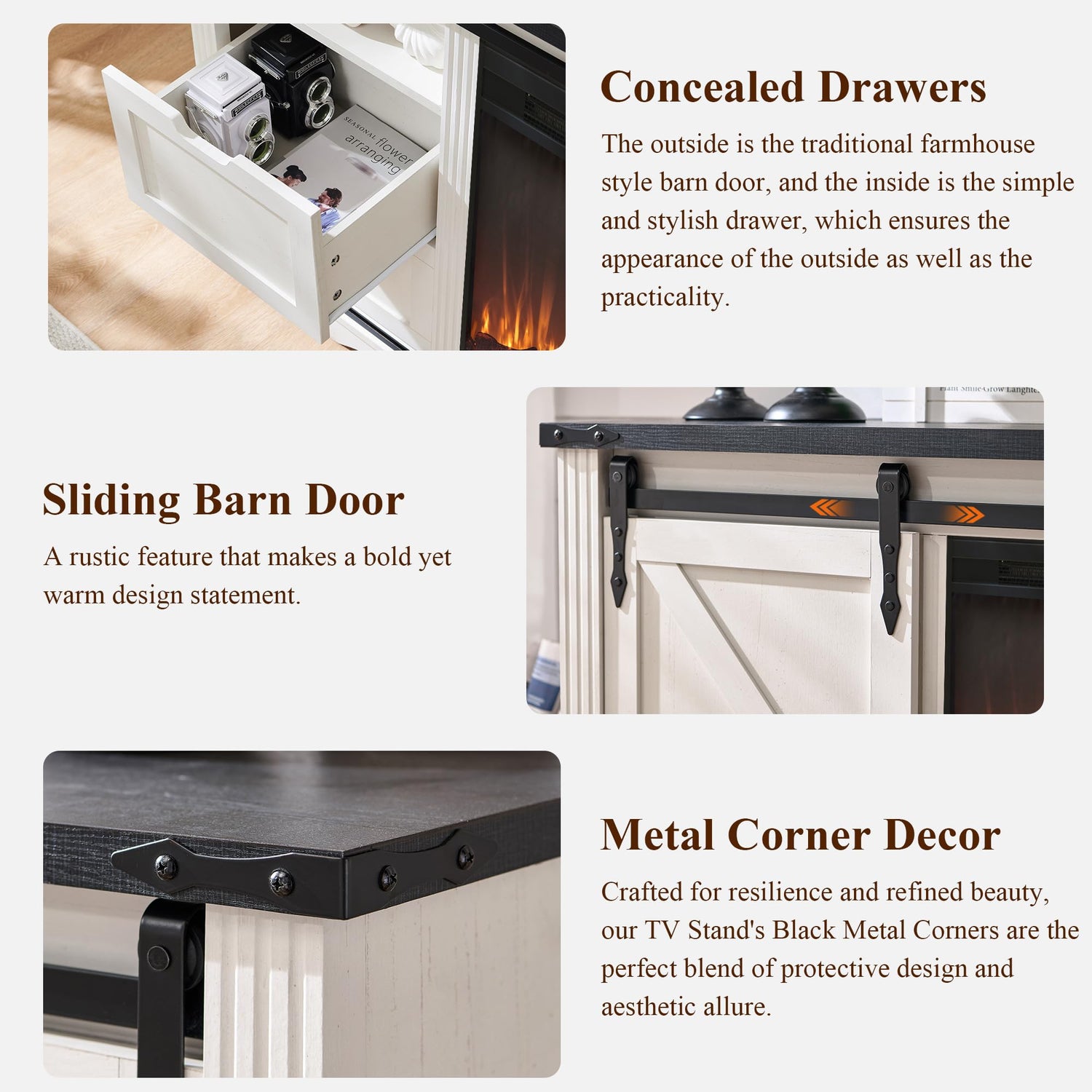 JXQTLINGMU Farmhouse Fireplace TV Stand for 80 Inch TV, 32" Tall Entertainment Center w/Drawer & Sliding Barn Door, 70 Inch Highboy Media Console for Living Room, Off White