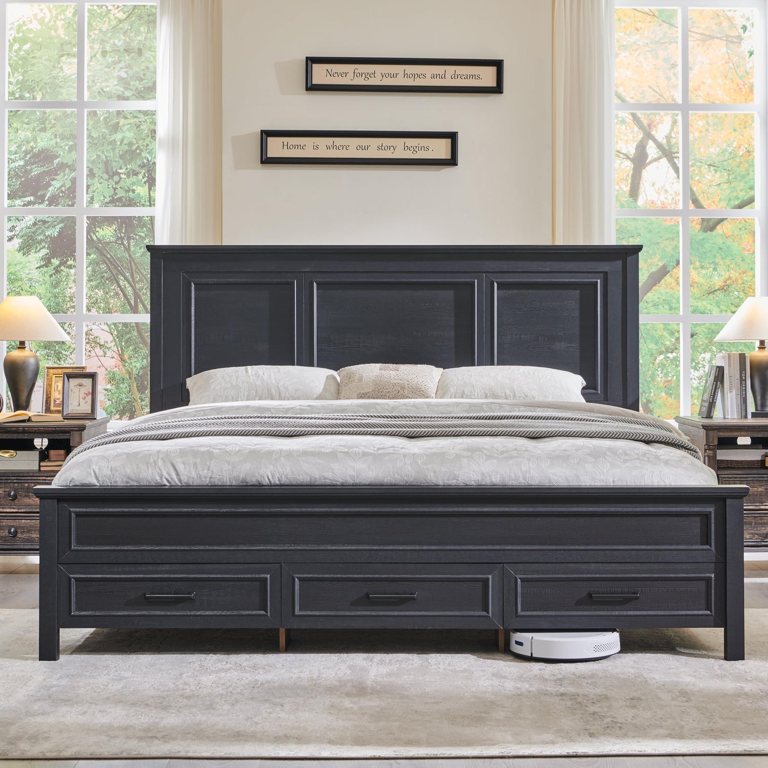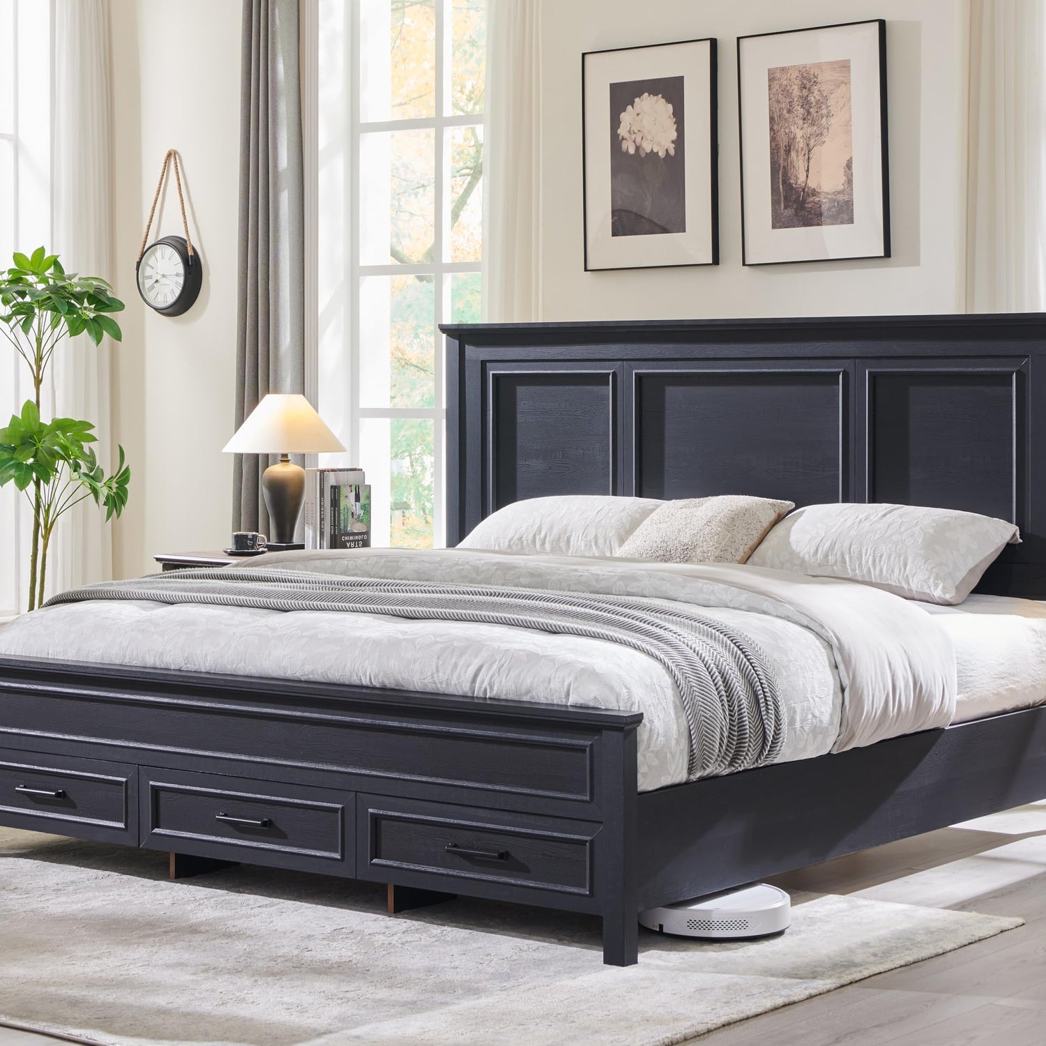 JXQTLINGMU Farmhouse Queen Wood Bed Frame with 52" Tall Headboard & Footboard, Platform Bedframe with Hidden Storage Drawers, Noiseless, No Box Spring Required, Antique Black
