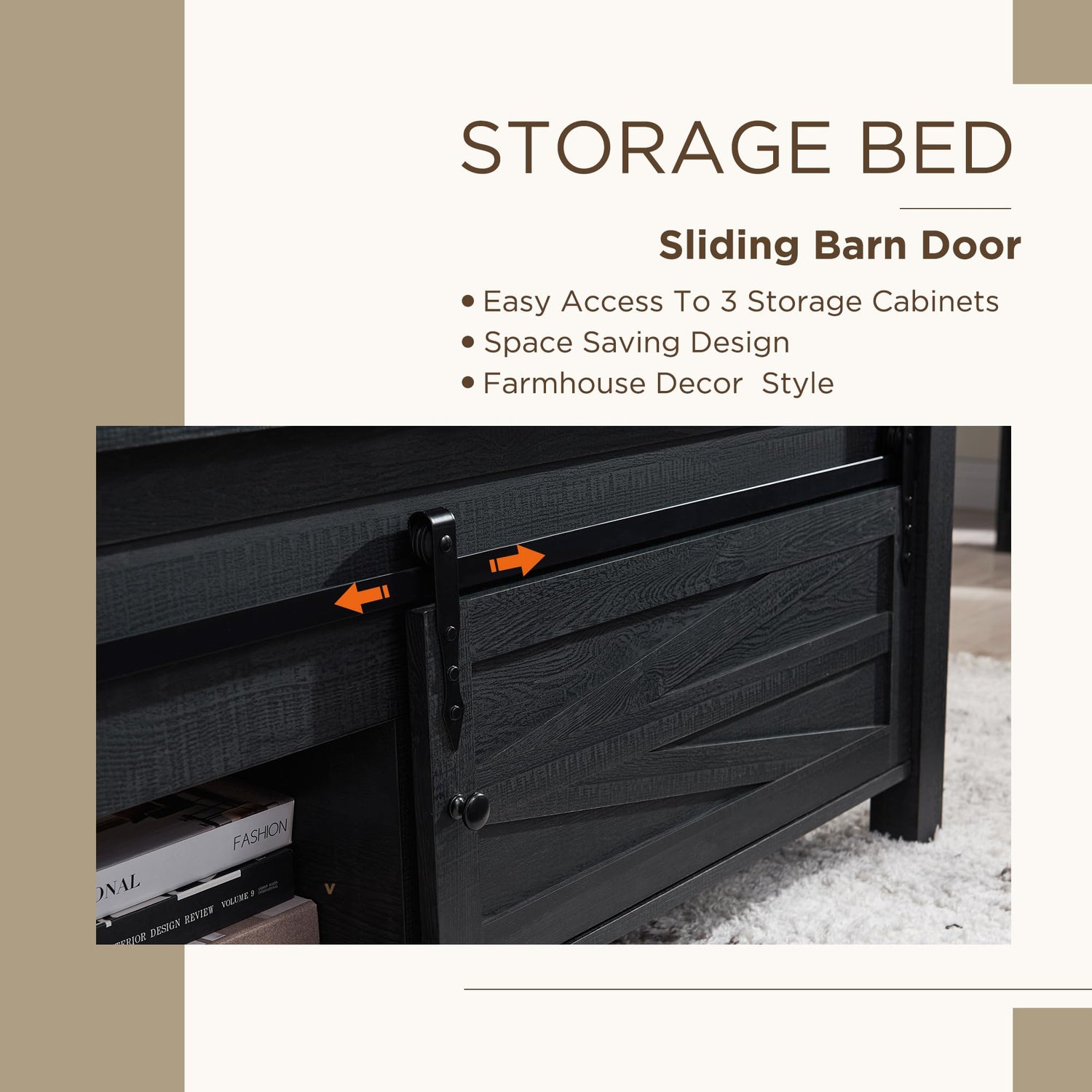 JXQTLINGMU Farmhouse Wood Bed Frame Queen Size with Sliding Barn Door Storage Cabinets and Headboard, Solid Wood Slats Support, Noiseless, No Box Spring Needed, Black