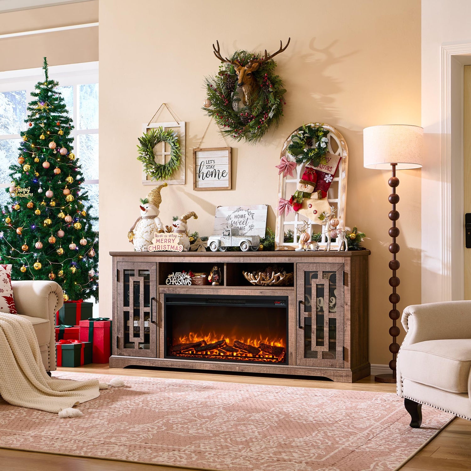 • 70" ELEGENT RUSTIC FIREPLACE TV STAND: Measuring: 70"W*15.5"D*32"H, fits TVs up to 75, 80 inch. Elevate your living room with the timeless allure of our farmhouse-style TV stand, seamlessly blending rustic charm with modern elegance. Side cabinets with glass doors and decorative mullions show off your style while 3 adjustable shelves keep your space organized. The weathered look is a perfect accent to any home, you will absolutely love how the color pairs so well with everything!