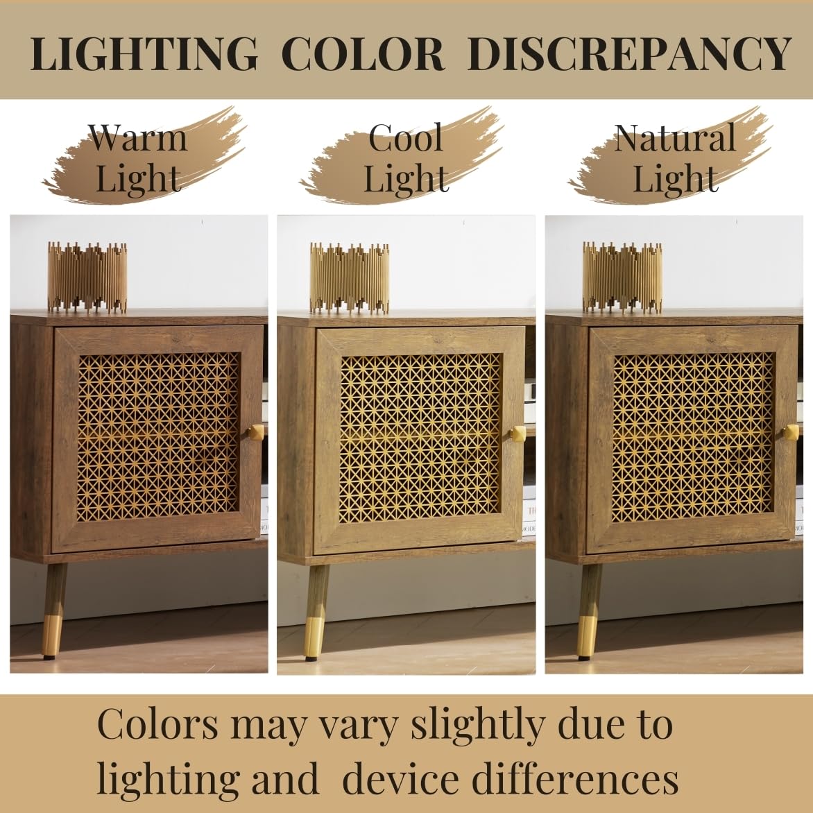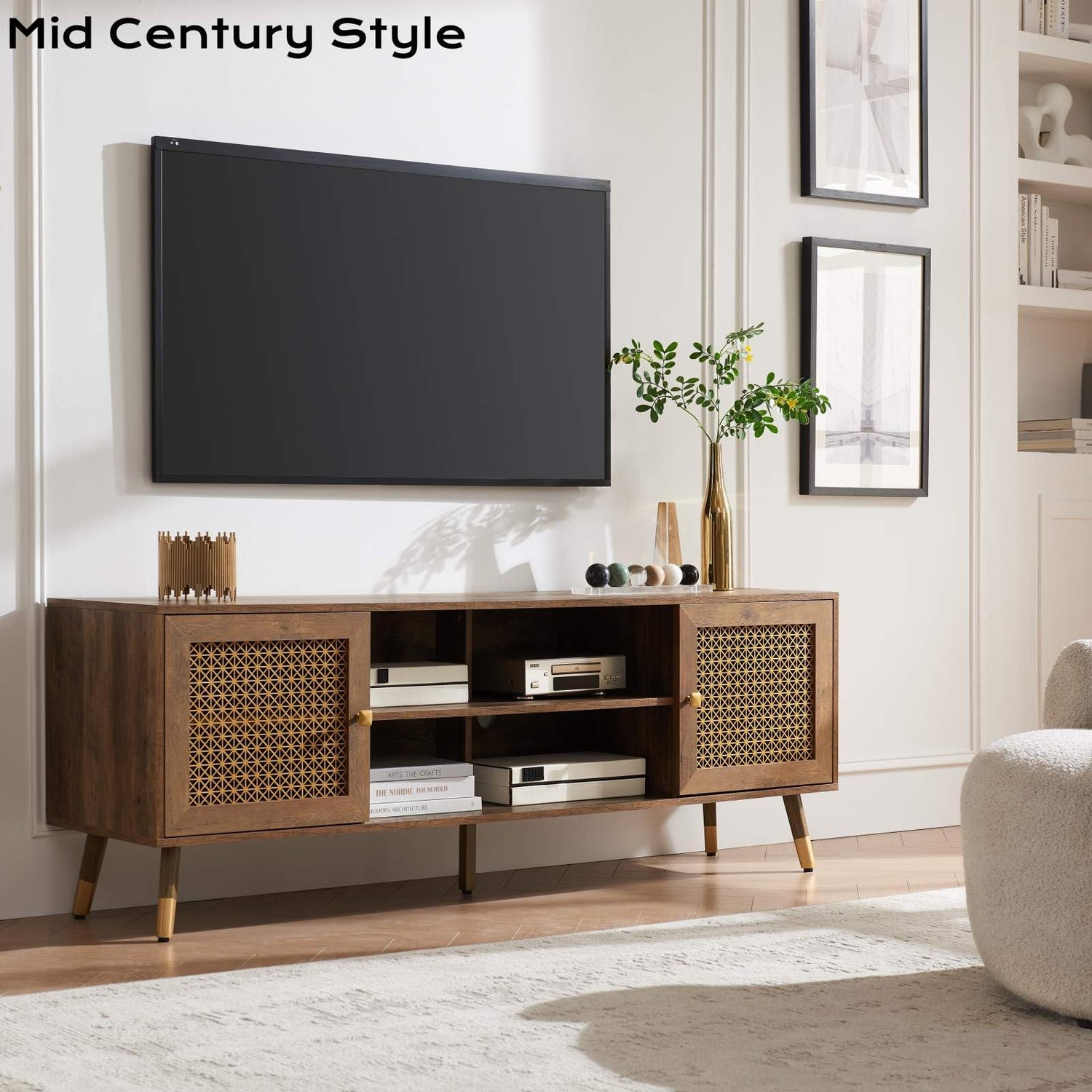 - Attractive Style: Mid-century modern TV stands combine fashionable metal elements with vintage wooden look. Its eye-catching golden metal mesh doors and stylish handles add a unique charm to your living room furniture. This TV console is perfect for a variety of decor styles