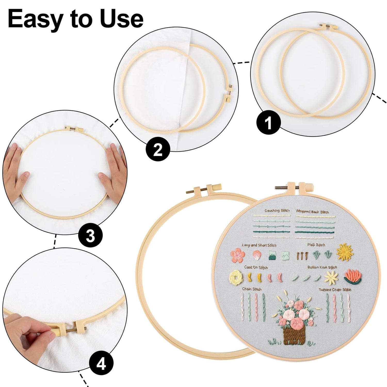 - Comprehensive Embroidery Starter Kit: 3 embroidered fabrics with patterns, 1 embroidery hoop, 3 instructions, 12 color threads, 9 embroidery needles, 2 needle threader, 1 seam ripper, 1 scissors
