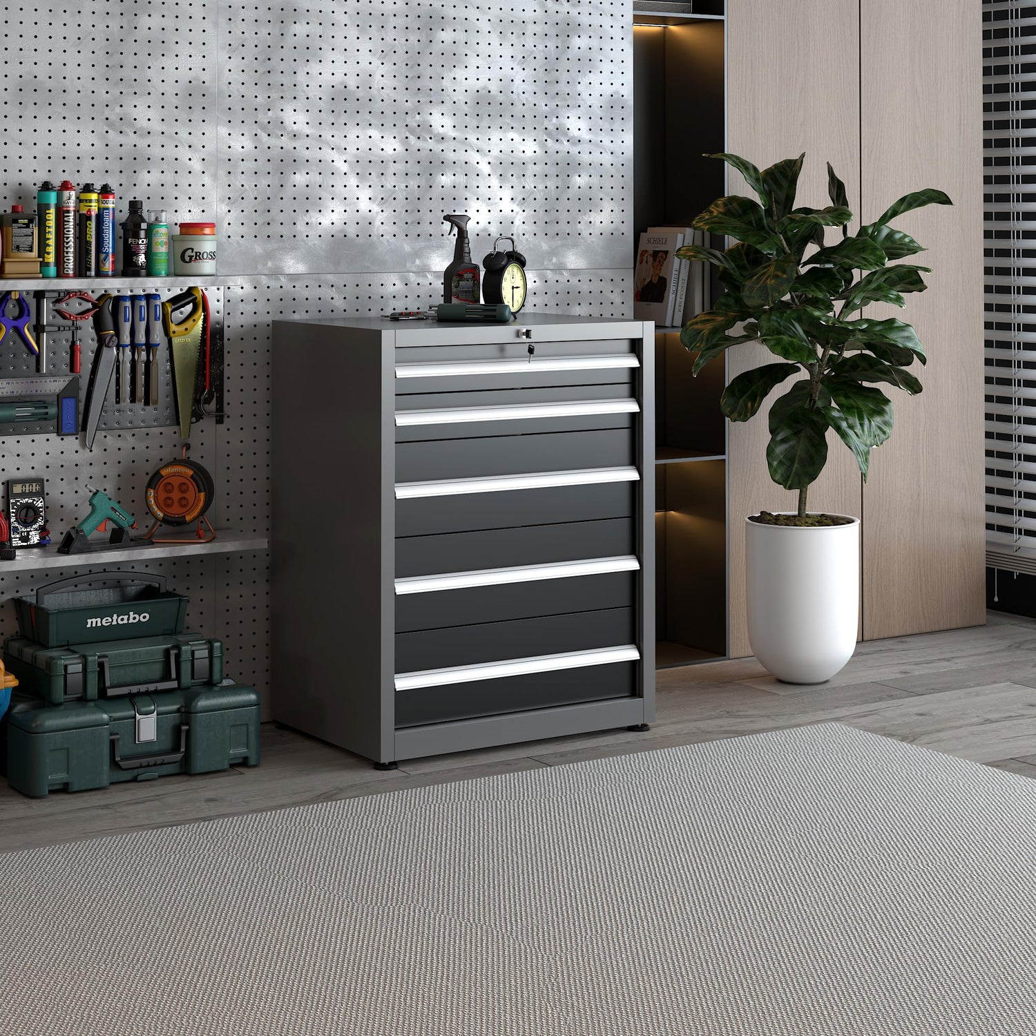 - 【Versatile Usage】With 2 small and 3 large drawers, the product caters to various storage needs for different tools. It is suitable for a wide range of settings including garages, workshops, storage rooms, factories, and more.