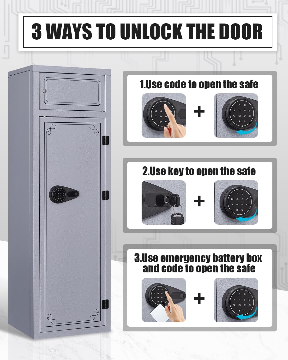 - 3.【Quick and Convenient Access to Gun safe】: There are two ways to unlock the gun cabinet: ①Enter your password on the number panel. ②Use the emergency key. When the battery runs out, Please use the External Battery Box to access the rifle safe. ( Note: Please do not lock the key inside the gun cabinet.)