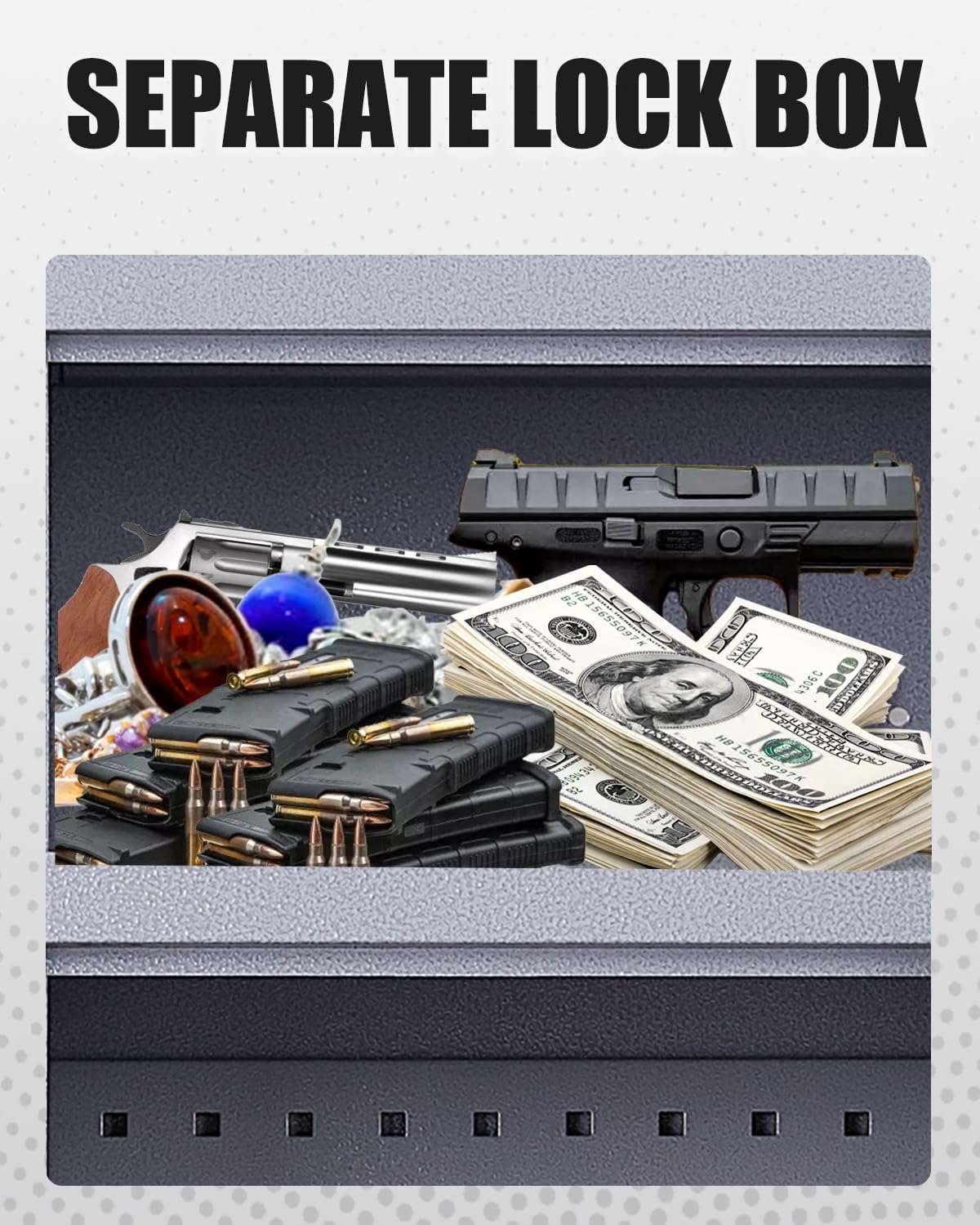 - 1.【Large Gun Safe with Separate Lockbox】: Larger and deeper rifle cabinet. Exterior dimensions: 57” (H) X 18.1” (D) X 17.7” (W). Top lockbox dimensions: 9.05” (H) X 17.71” (W) X 13.58” (D). This gun cabinet can accommodate 10-12 rifles up to 45” (with/without scope). This gun safe has 3 gun racks and the position can be adjusted to suit the length of the gun.