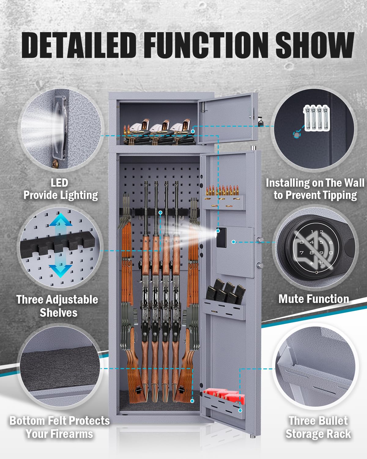 - 4.【Product Details of The Rifle Safe】: ①Rifle Gun safe with external hinge can be opened up to 180 degrees for easy access to your guns. ②LED light: When you use the password to enter the gun cabinet, the LED light will light up. ③Silent mode: Press the“*”for 3 seconds turn sound off or turn sound on. ④Locking function: The system will be locked for one minute when wrong code is entered 5 times.