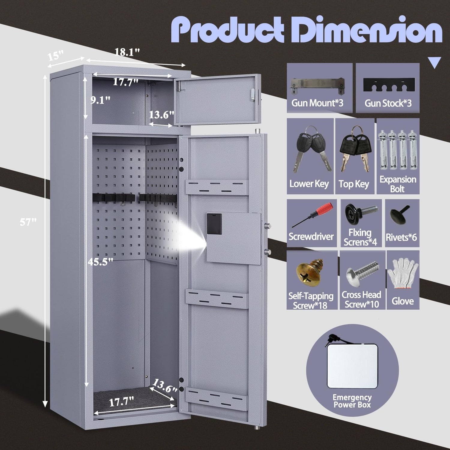 - ✅【Super Storage Space Gun Safe】:Gun cabinet size: H56.96" X W18.1" X D14.96", Compared with similar products, it has a deeper and wider storage space, and has two layers of storage space. If you feel that the height of the lower layer is not enough, you can remove the middle partition so as to reach the corresponding height of your gun.so that you can make full use of the storage space.