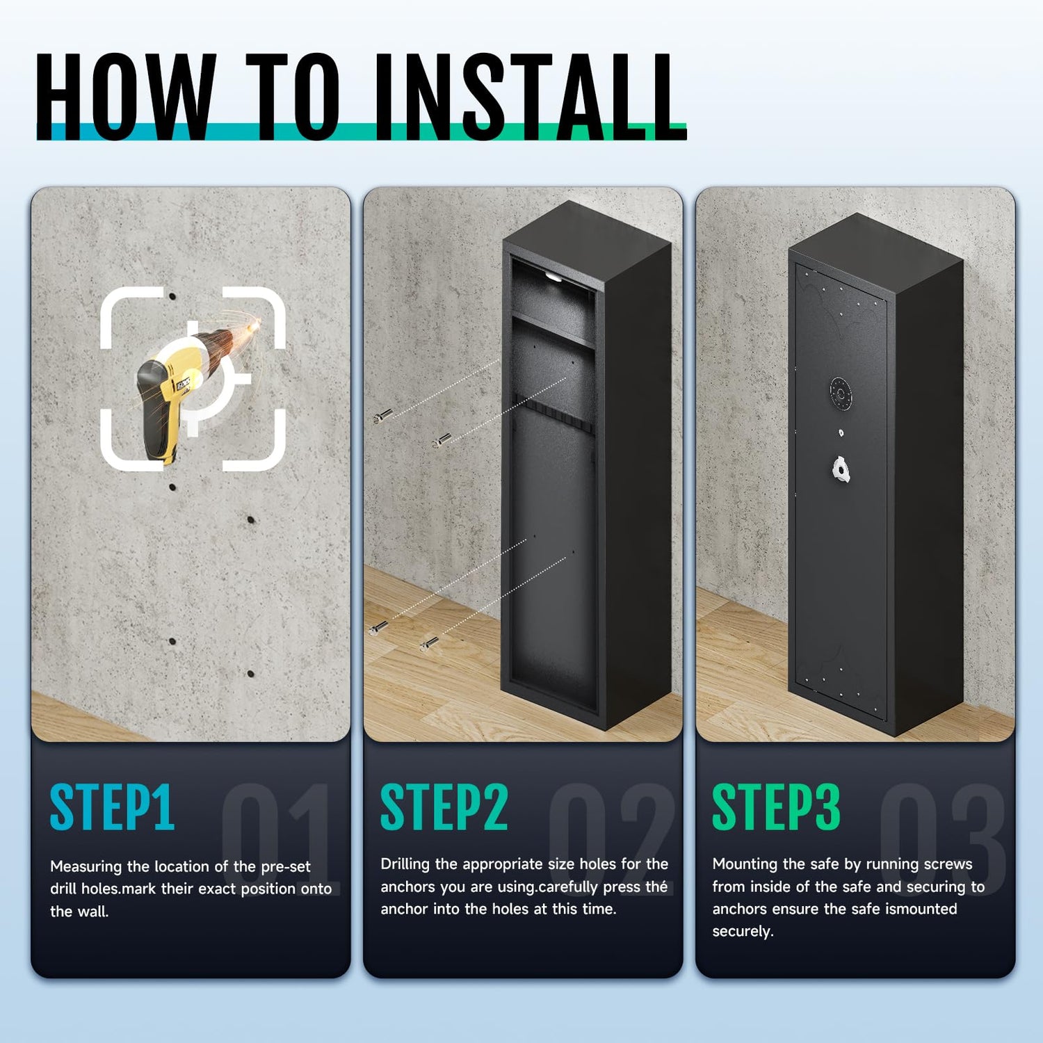 - [ Easy-to-Install Gun Safe for Rifles ]: Designed for straightforward setup, this gun safe for rifles includes detailed instructions and an online installation video. For enhanced security, use the provided expansion screws to anchor the cabinet to wall studs or flooring in your garage or basement—effectively transforming it into a fixed, non-removable gun safe that supports legal and responsible storage.