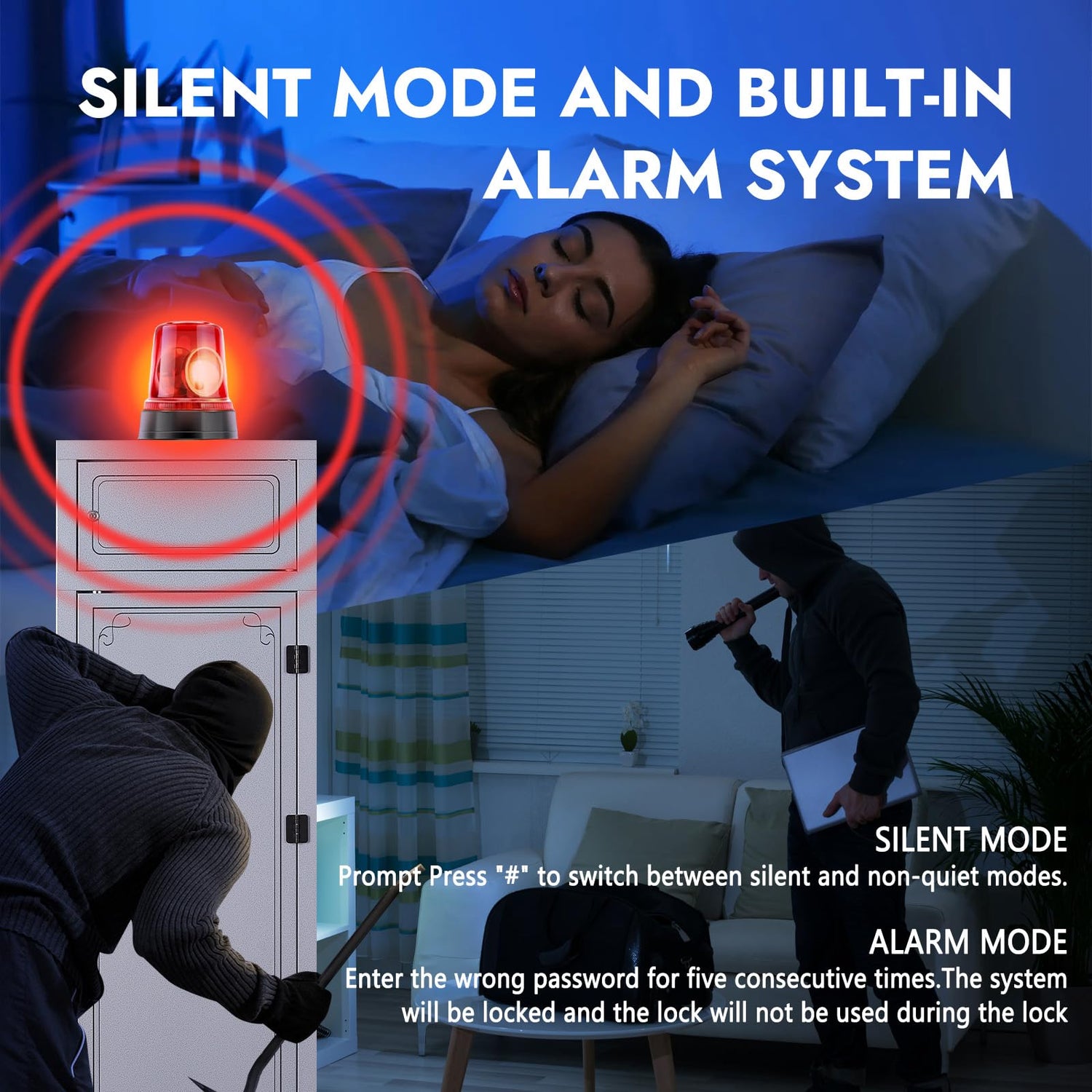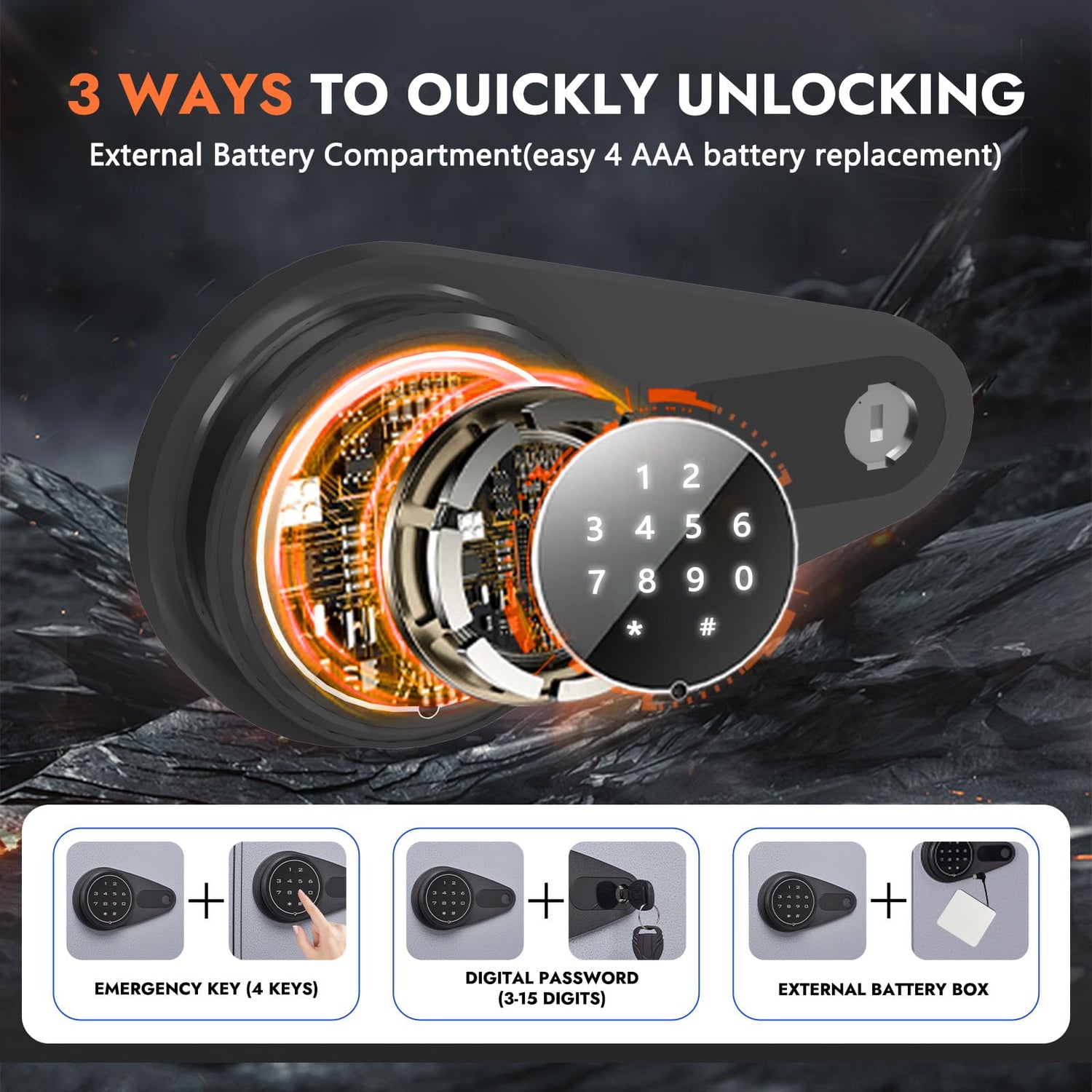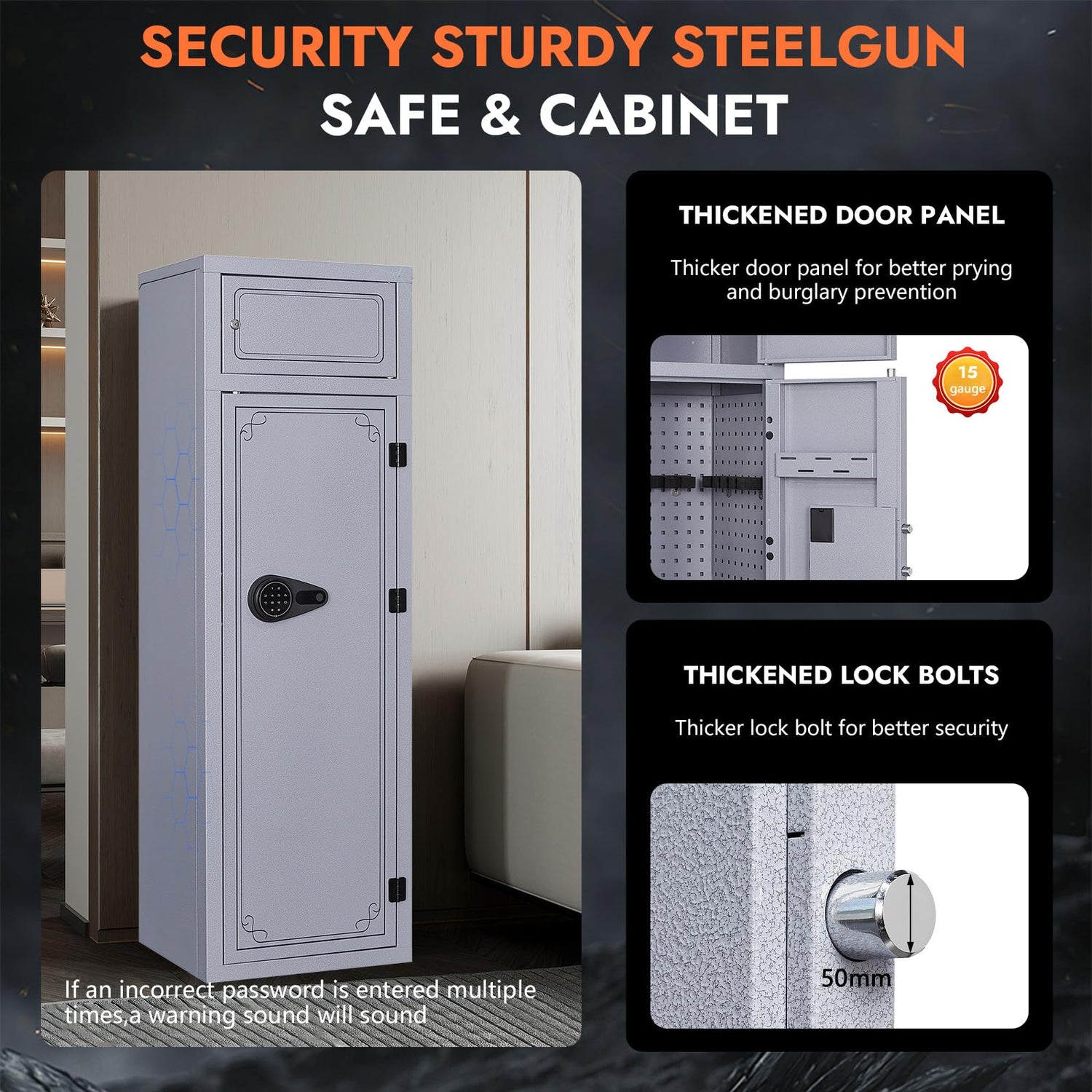 - Quick Access Rifle Safe:The gun cabinet is equipped with a triple locking system. Including PIN code, spare key and emergency power box. The gun safe is equipped with a silent mode, facilitating covert access. It features an alarm mode for incorrect password input, ensuring convenience while enhancing security. (Note: Do not lock your key in the gun cabinet.)