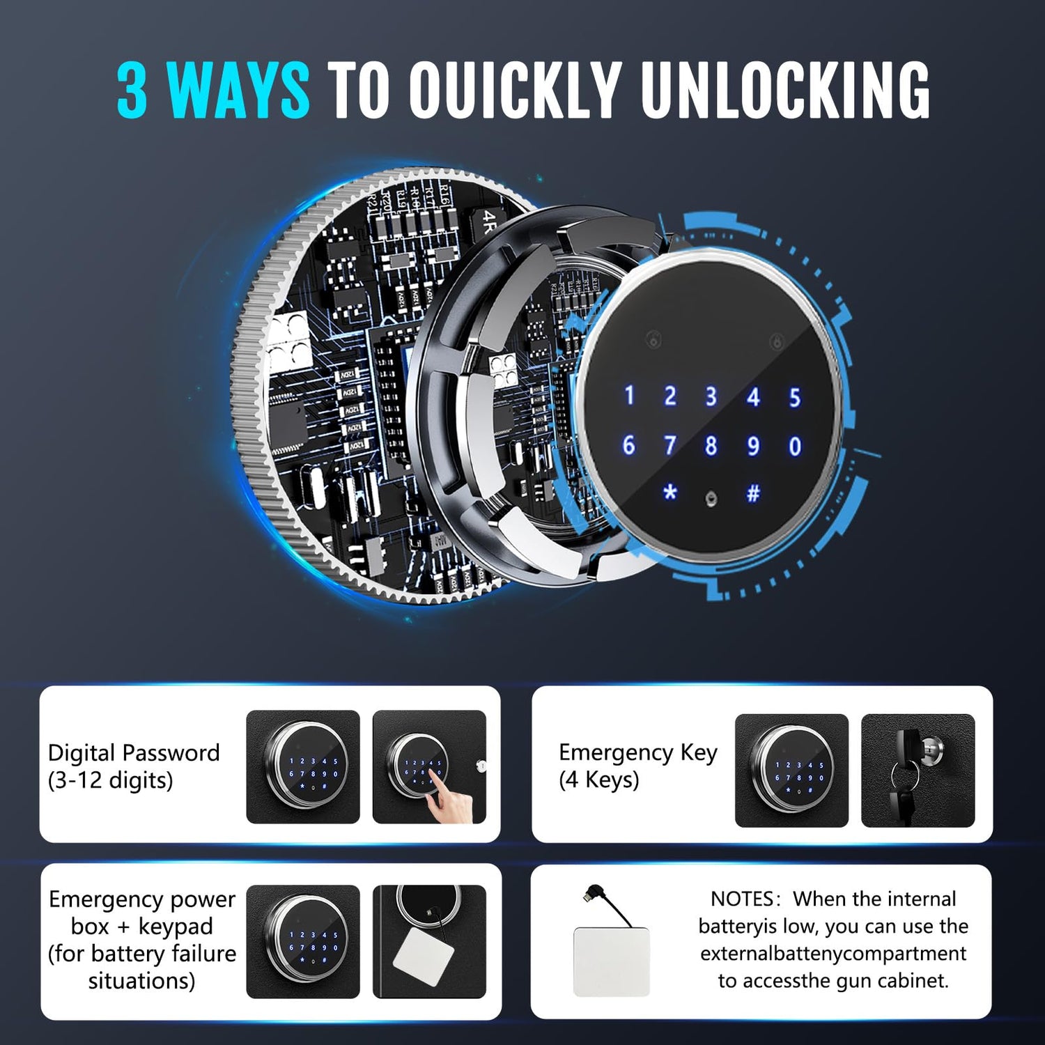 - Digital Gun Safe:The advanced electronic lock system enables quick access to the gun safe.It can be accessed quickly with an electronic password or emergency key,enhancing security and concealment.It is also equipped with an emergency power box for access in case of emergency when the battery in the gun cabinet runs out. (Note: The key to the gun cabinet door, the key to the top independent storage box and the key to the drawer are all separate)