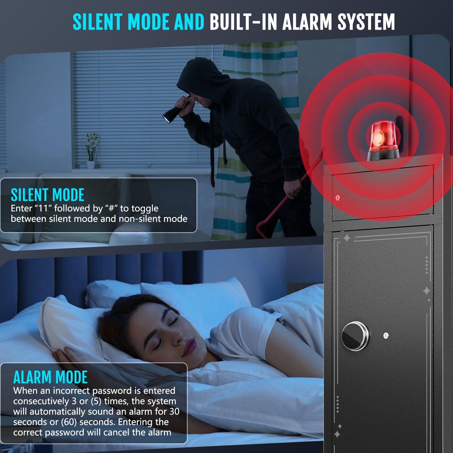 - Silent and Built-in Alarm System:This gun safe is equipped with silent and alarm modes,making it convenient for covert access.When the password is entered incorrectly for three consecutive times,the alarm system will be triggered.Press "11#" to activate the silent mode,enhancing concealment and preventing disturbance to others, ensuring convenience while increasing security