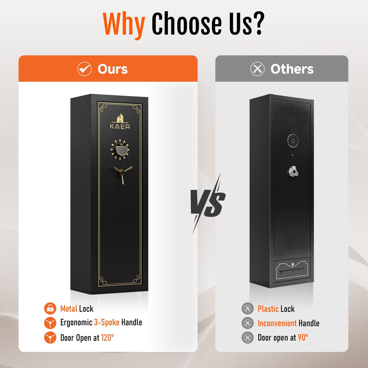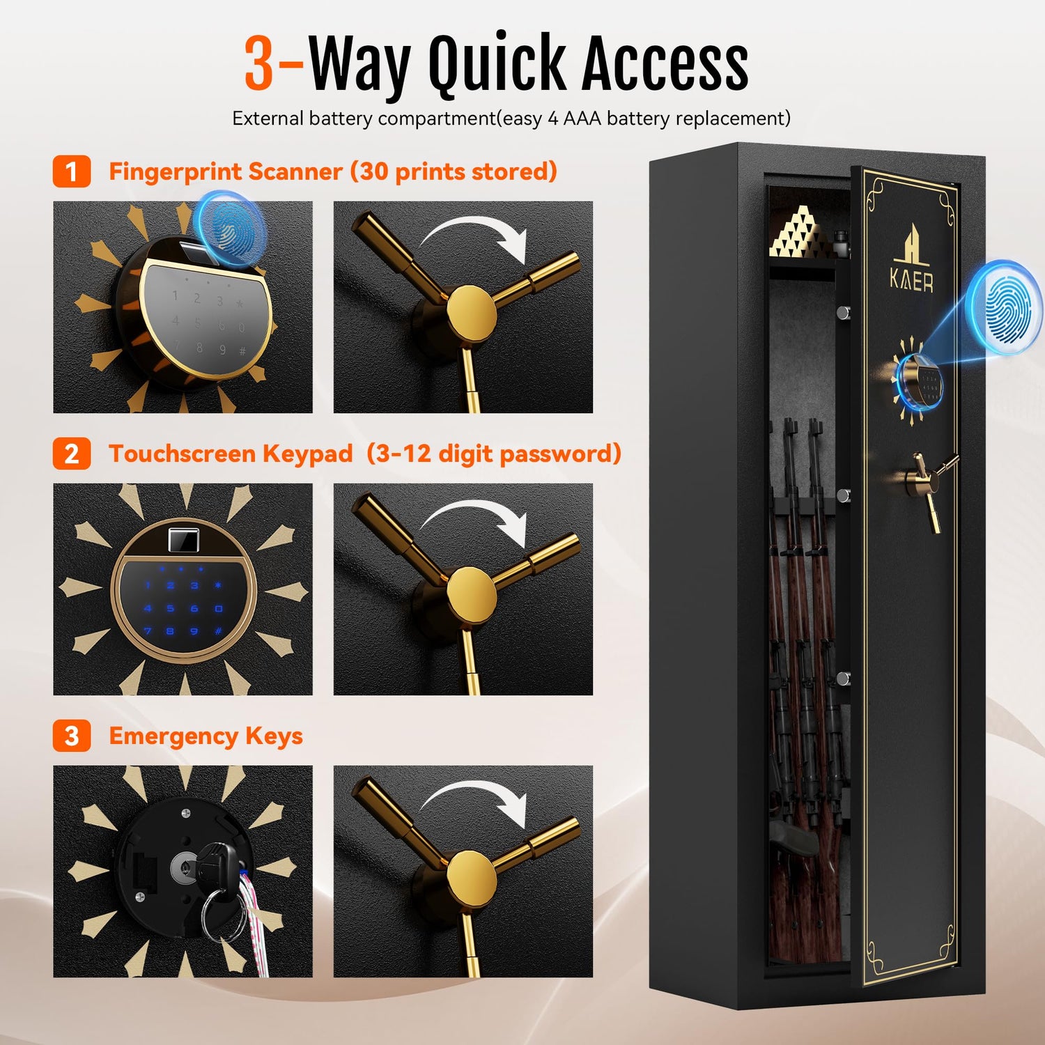 - 【Advanced Biometric & Multi-Lock Security】Kaer fingerprint gun safe features a high-precision semiconductor fingerprint scanner, keypad, and emergency keys for quick access. The new fingerprint gun safe can store up to 30 fingerprints, ensuring secure and fast entry to your rifle safe or gun cabinet. (Battery not included).