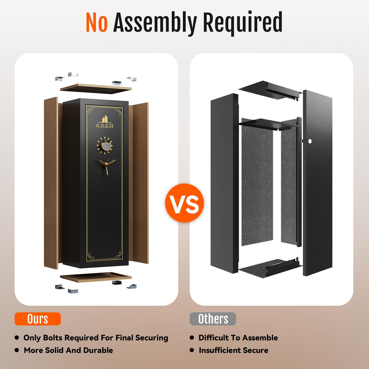 - 【No Assembly Required】This kaer gun safe for rifles and pistols comes pre-assembled with pre-drilled holes and mounting hardware, allowing quick installation on floors or walls. Rifle safes for home integrally welded design ensures maximum sturdiness and safety without the need for additional assembly.