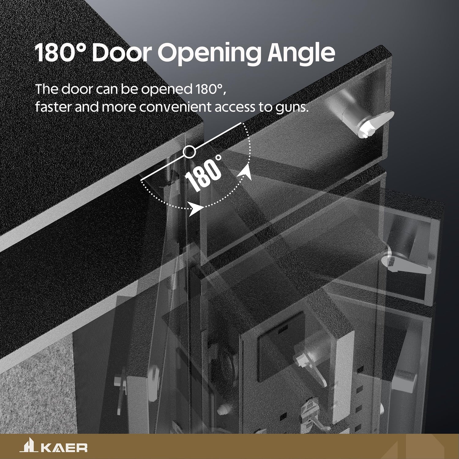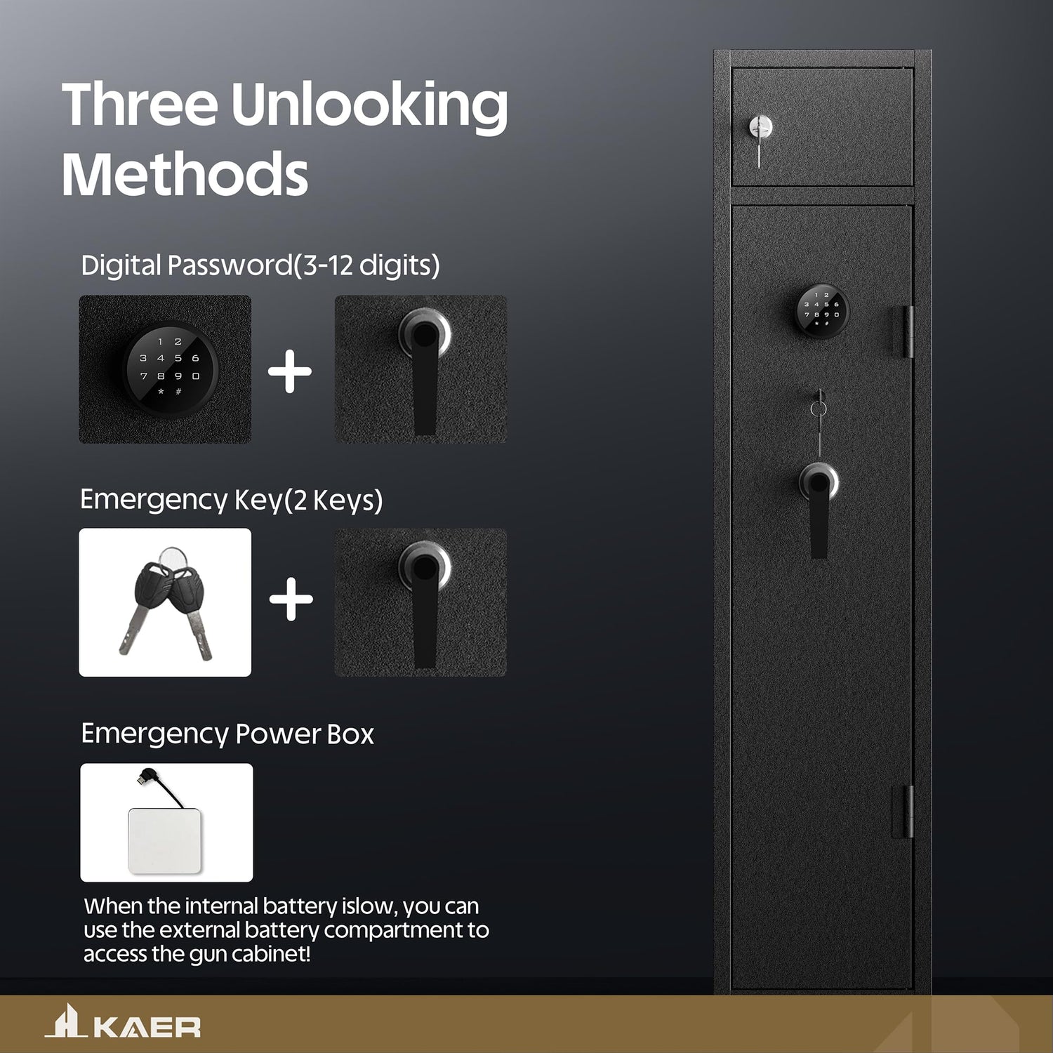 - Quick Access Cabinet Gun Safe- 180 degree door opening angle makes access to firearms more convenient. Gun cabinet for rifles and shotguns has three ways of opening, electronic combination lock, key unlocking, an emergency power box. When the battery runs out, Please use the External Battery Box to access the rifle safe.(Note: batteries not included)