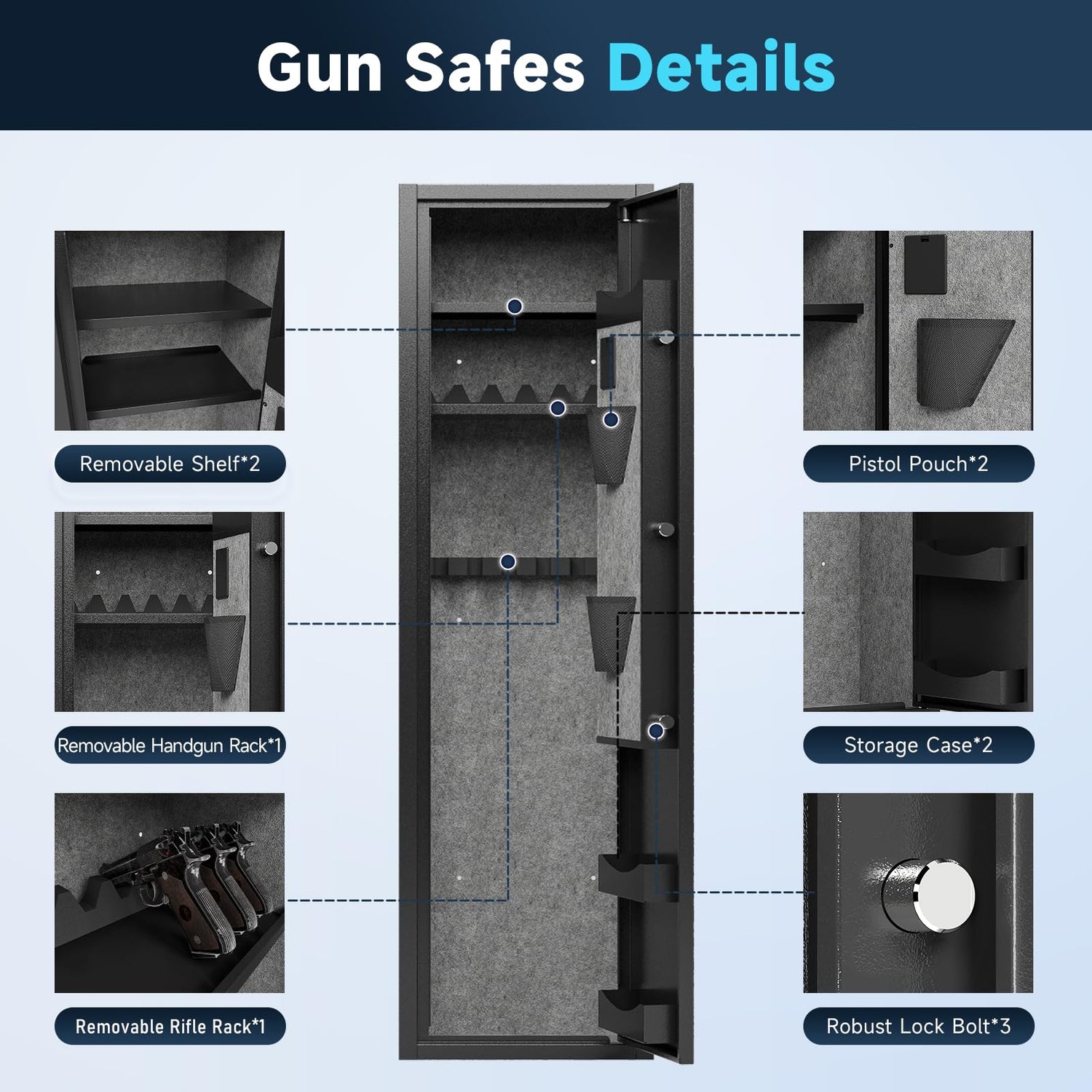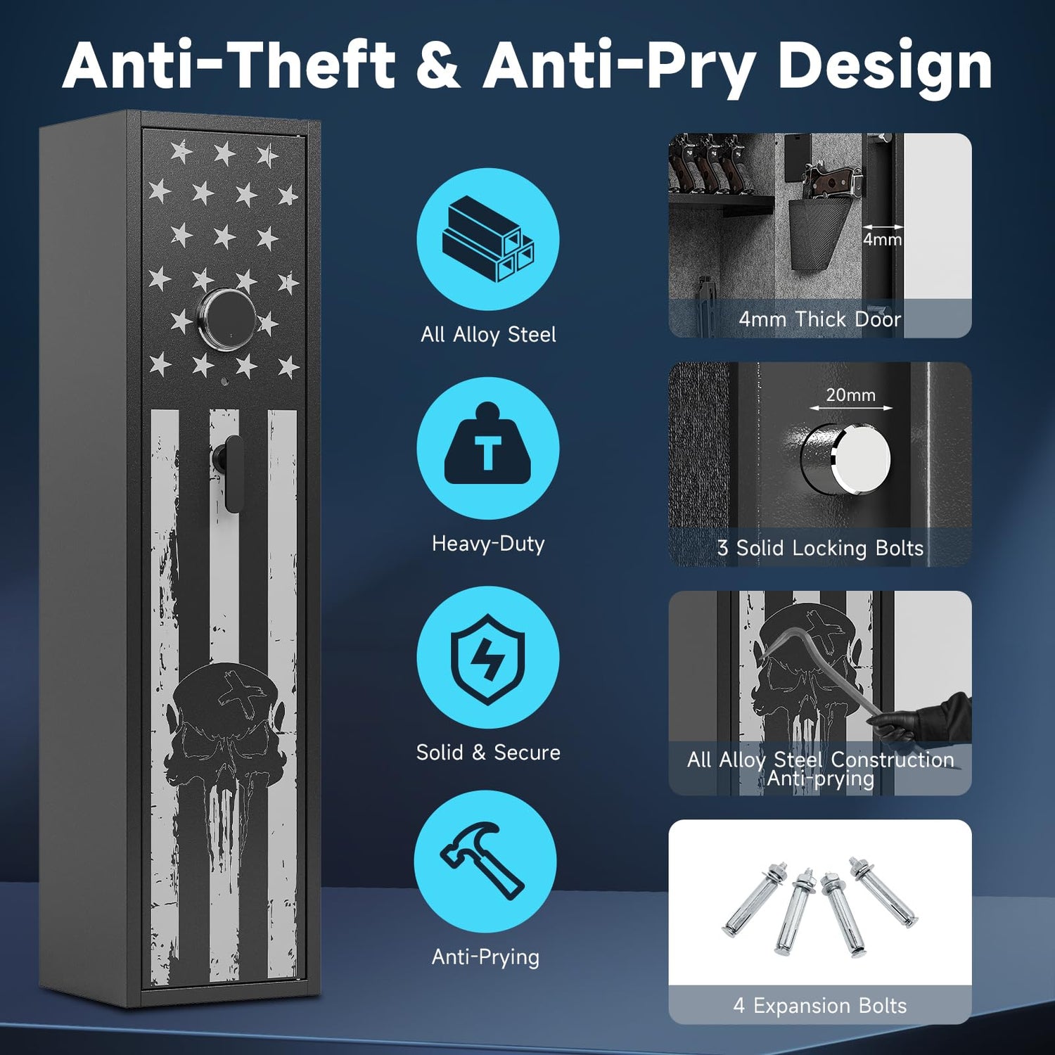- Solid Steel Construction Safes- Gun safe for home rifles and pistols, Crafted from heavy-duty all steel. Rifle safe has 4mm thick door and 3*20mm steel locking bolt with anti-tampering and anti-pry features. This gun safe is robust and durable, and the felt cloth inside the gun cabinet protects the gun from scratches