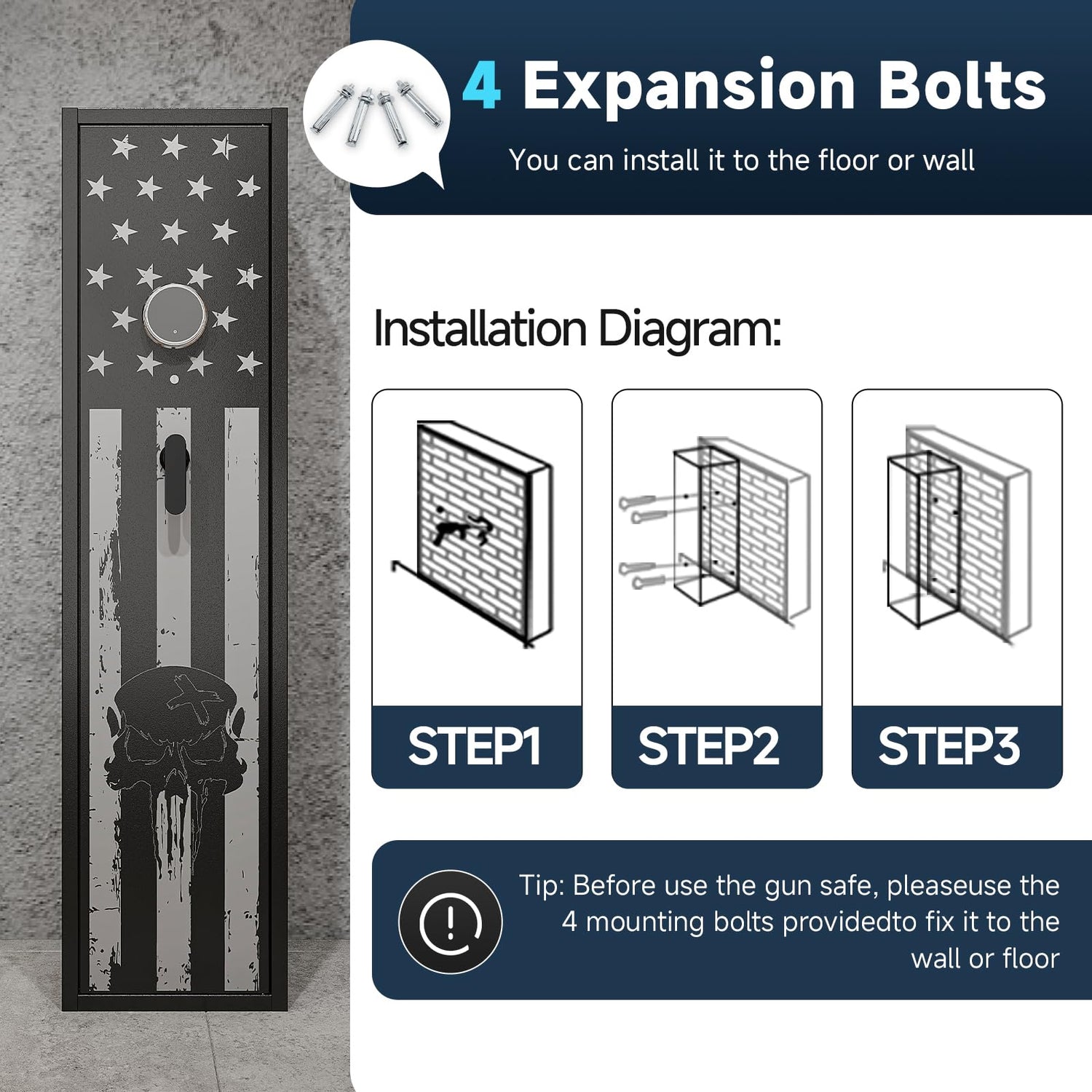 - Rifle Cabinet For Multi-Scenario Storage- Come with 4 expansion bolts and gun locker have pre-drilled holes on the back and bottom to secure the safe to the wall or floor. The home shotgun safe is perfect for living room, bedroom, closet, under the stairs, garage, tool room, and so on