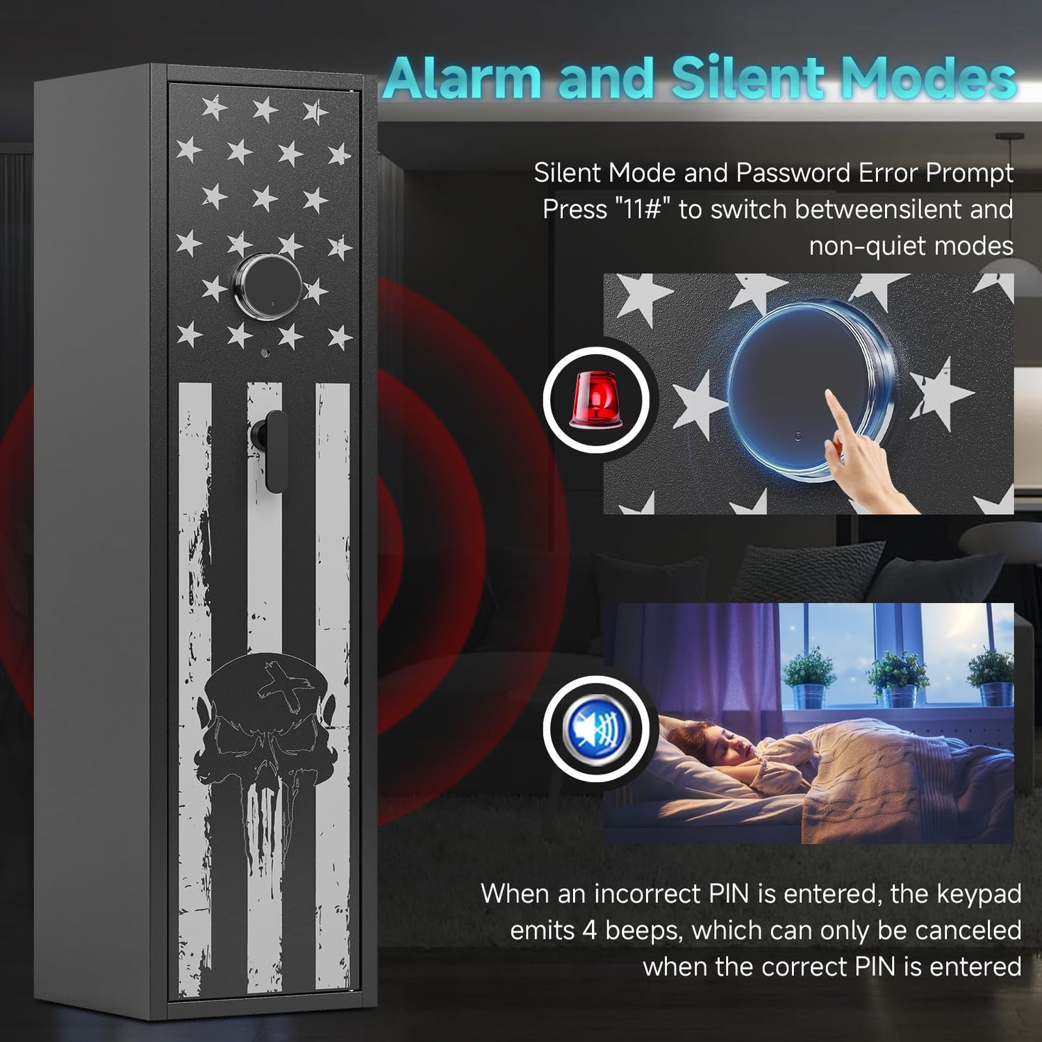 - Intelligent Warnings To Protect Your Family- KAER gun safe with intelligent warning system. When someone lost the wrong password 3 times, the rifle gun safe will have an alarm ringing, which can cause us to be alerted in time so that we can go to check it out. It can effectively keep away from children and avoid danger