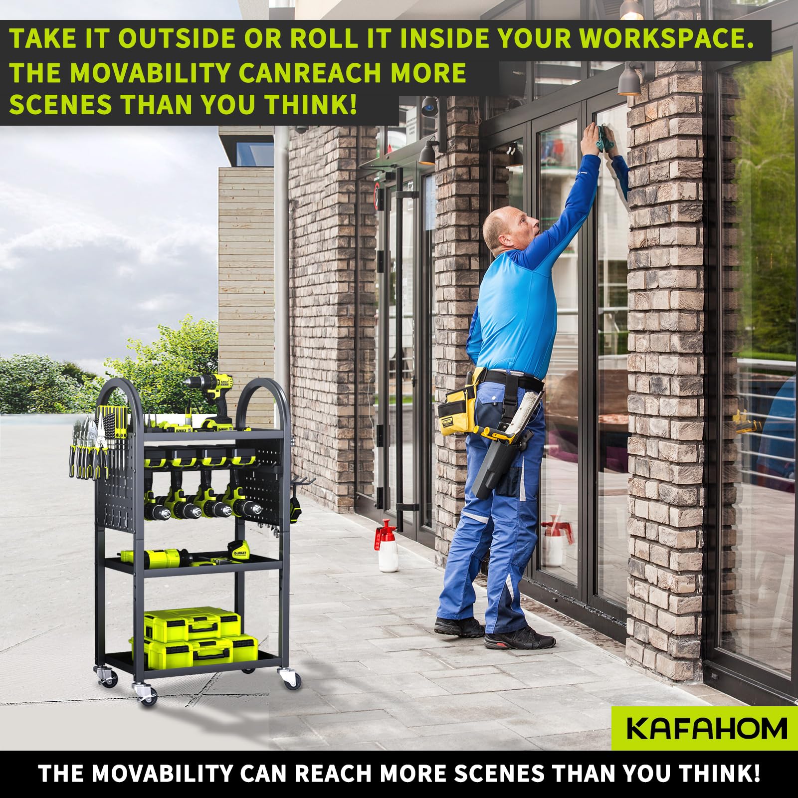 - MOVABLE AND FLEXIBLE: You read that right - It's a 4 Layer Heavy Duty Metal Power Tool Storage Rack that can move anywhere! The KAFAHOM Power Tool Organizer for Tool Storage 's four 360° wheels can be locked and moved around freely to meet your needs. No longer only for daily indoor use, the rolling tool cart is now perfect for various industrial settings, including outdoor settings like backyard work fields, garage workshops, or professional scenes.