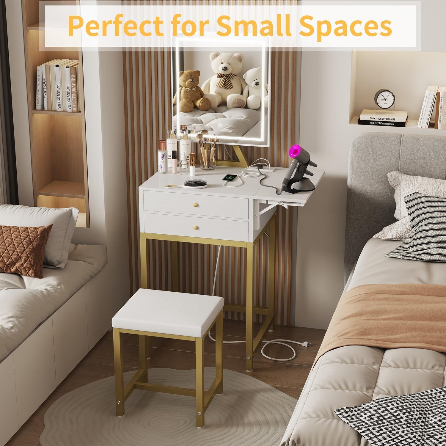 KAI-ROAD Small Makeup Vanity Desk with Lights - White Girls Vanity Set with Mirror and Chair, Make Up Dresser Table with Drawers and Power Outlet for Bedroom Small Space, Gold