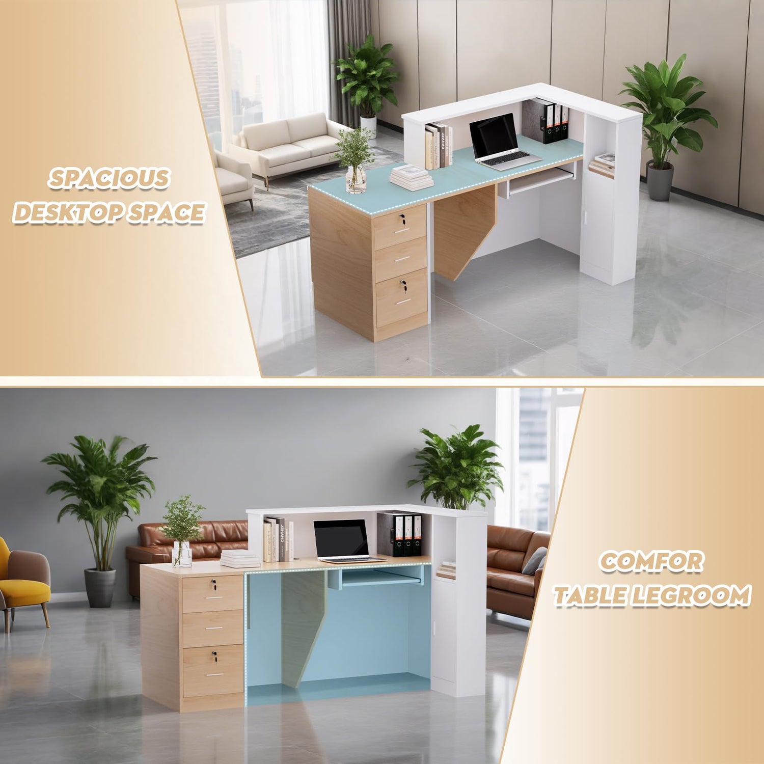 - 🔒 AMPLE STORAGE WITH LOCKABLE CABINETS: Features lockable file cabinets, open display shelves, and a hidden keyboard tray—ideal for securing documents, organizing office supplies, or showcasing retail products. The multi-layer side storage keeps your front desk workstation clutter-free.