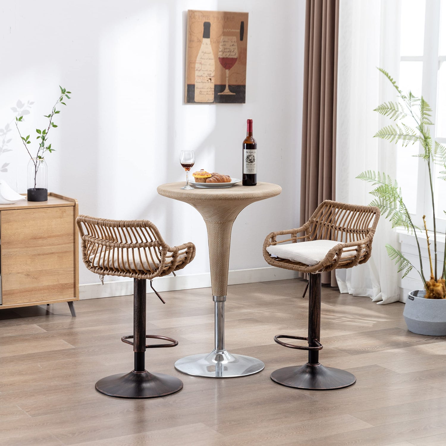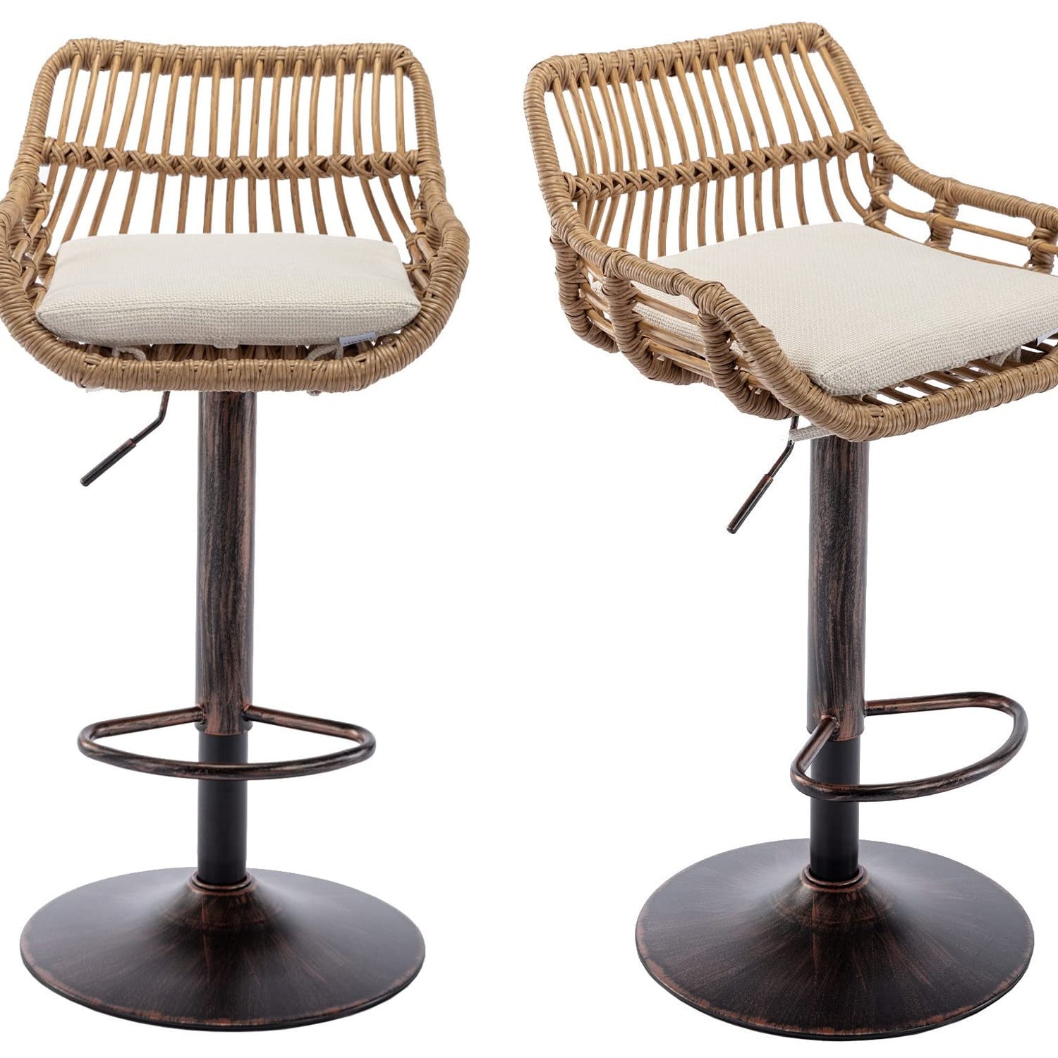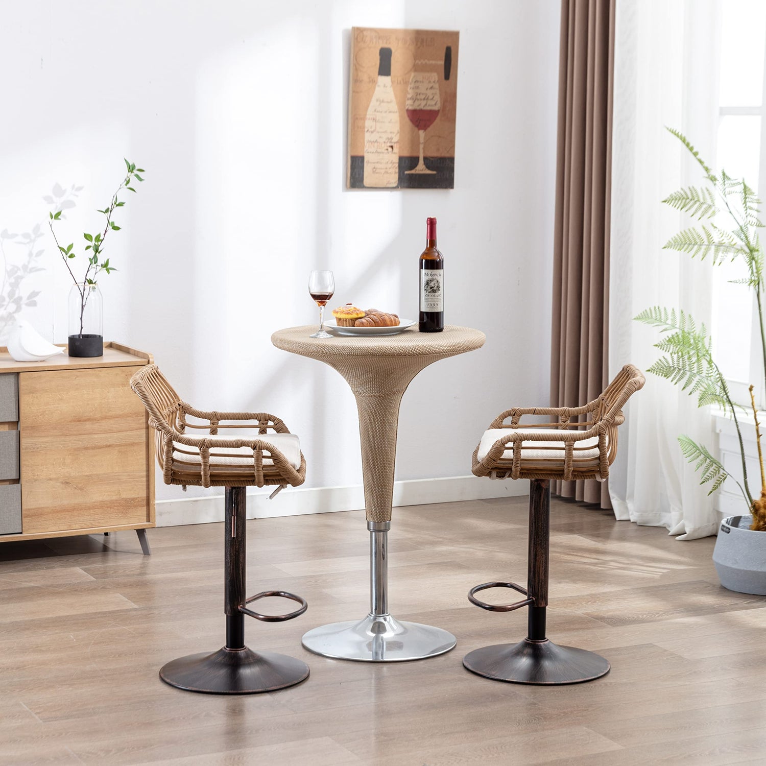 Kakotito Rattan Bar Stools, Adjustable Barstools with Linen Cushion, 360° Swivel Bar Stool with Low Back & Footrest, Classical Barstool Set of 2 for Kitchen and Bar (Brown)