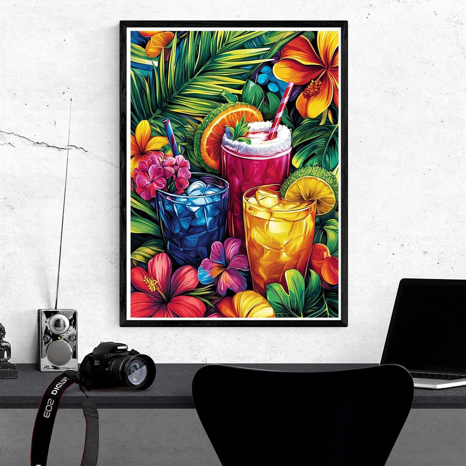 - Tropical Beverage Symphony: In a vibrant tropical paradise, three colorful drinks sit amidst lush greenery and bright flowers. The scene evokes a sense of relaxation and joy, perfect for a sunny day in the tropics. Each drink is garnished with fresh fruit and a straw, ready to be enjoyed. The surrounding foliage and blooms add to the cheerful and lively atmosphere, making it a delightful moment to cherish.