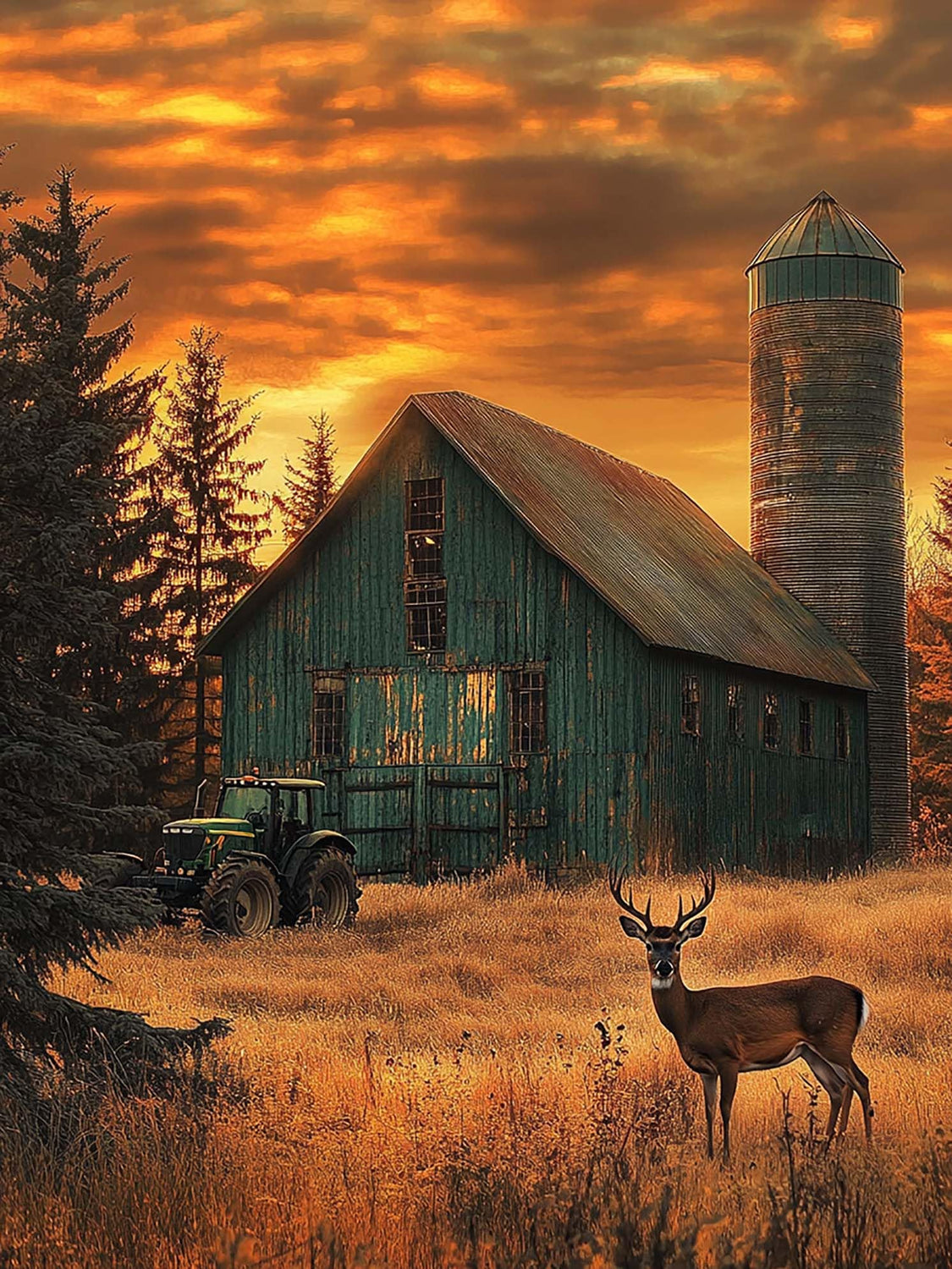 - Rustic Barn Twilight: In the golden light of dusk, a serene farm scene unfolds. An old barn stands tall, its weathered green paint peeling back to reveal the passage of time. Nearby, a tractor rests after a day's work, while a majestic deer grazes peacefully in the field. The sky above is painted with vibrant hues of orange and yellow, casting a warm glow over the landscape. This tranquil moment captures the essence of rural life, where nature and hard work coexist harmoniously.