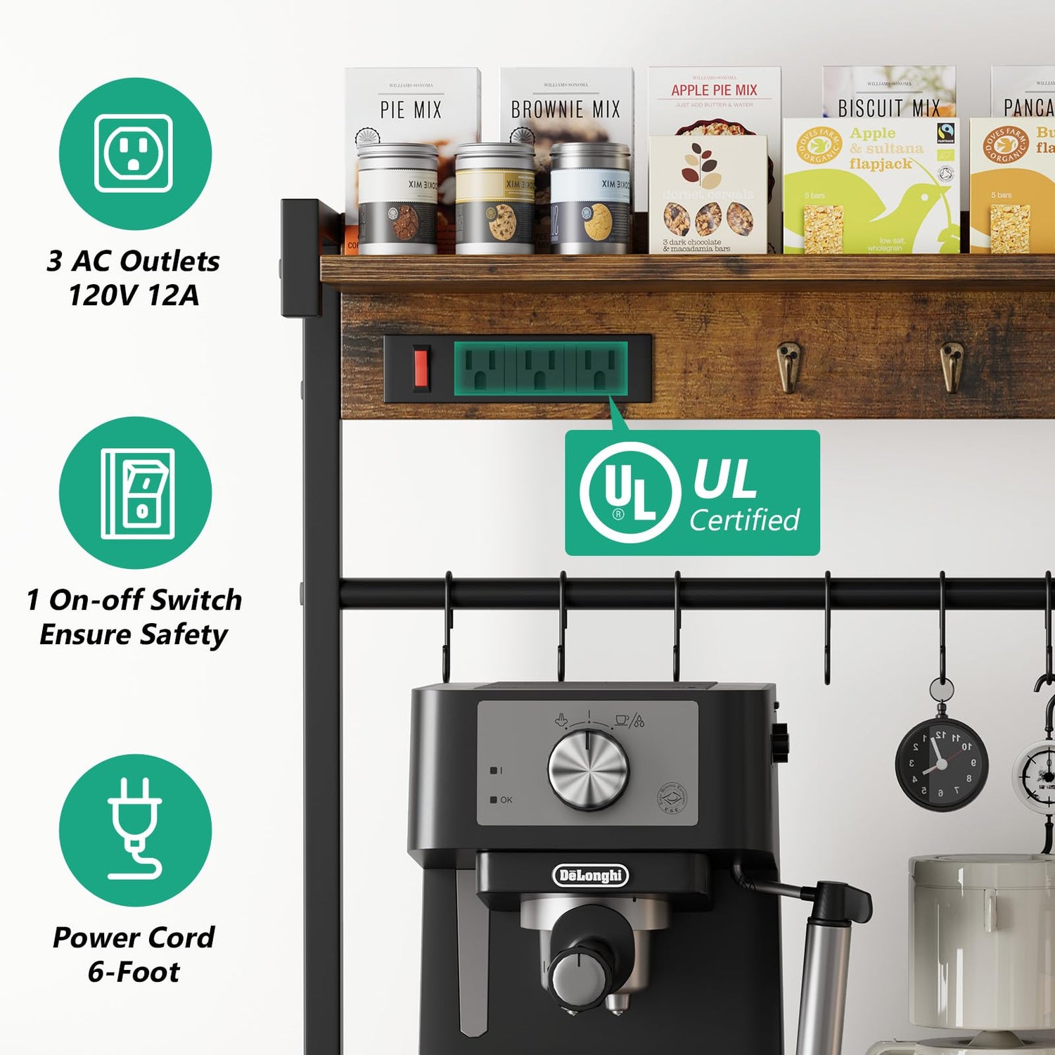 Kalrin Rustic Brown Large Bakers Rack with Power Outlets, Hooks, and Wire Baskets for Organised Kitchen Storage