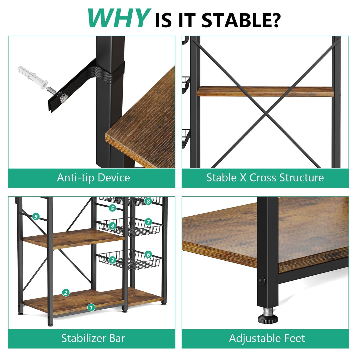 - Sturdy and Stable Construction: The combination of a robust metal frame, X-shaped crossbars, adjustable feet, and anti-tipping devices ensures that this kitchen storage rack remains reliable and stable. The durable particle board can support up to 120 pounds, making it both functional and resilient.